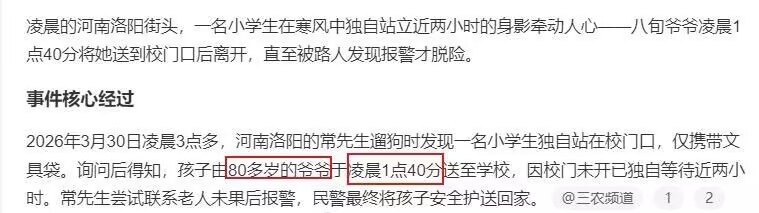 小学生凌晨1点40被爷爷送到校门口爷爷都八十多岁了,老人哪是糊涂啊,是年纪大了记