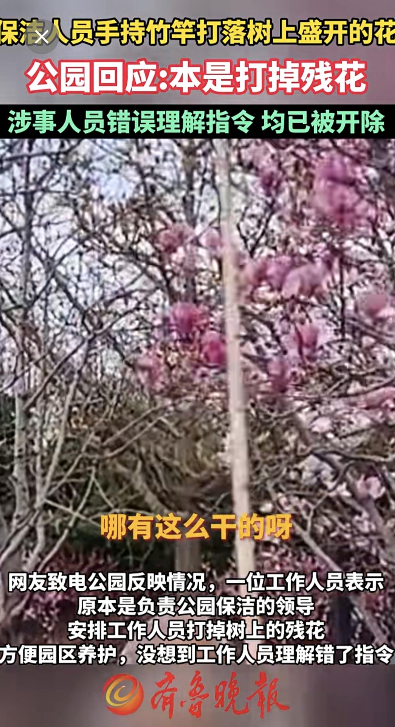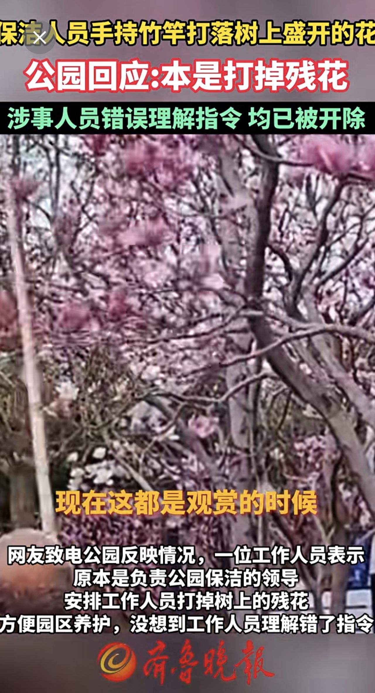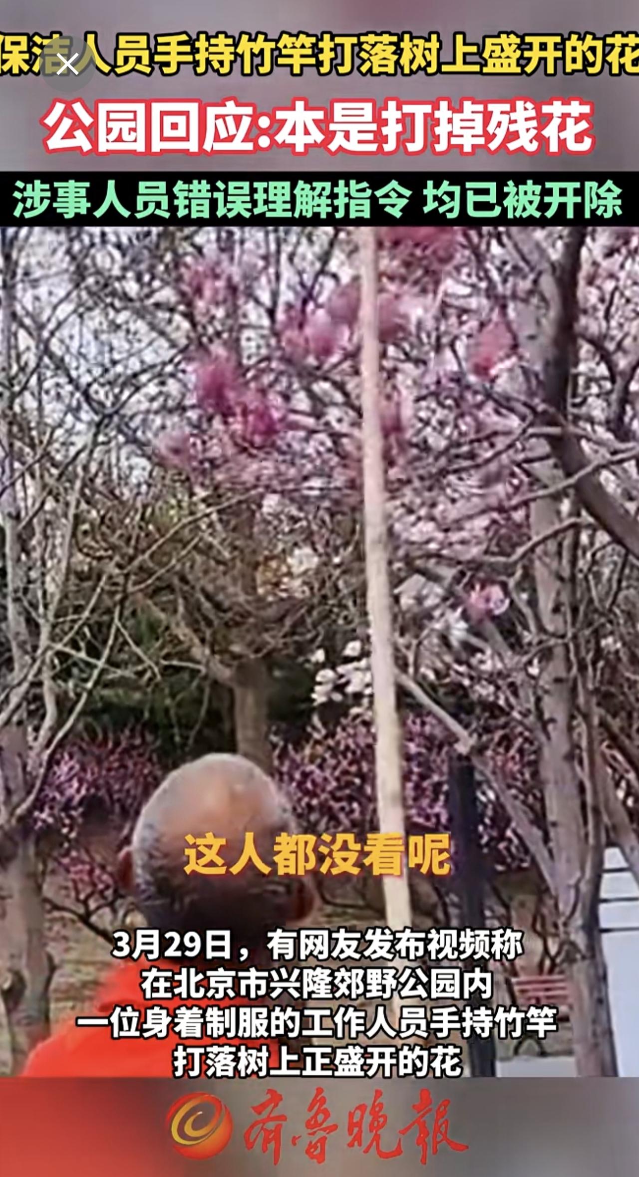 北京一公园保洁人员手持竹竿打落树上盛开的花,园方:涉事人员错误理解指令,均已被开