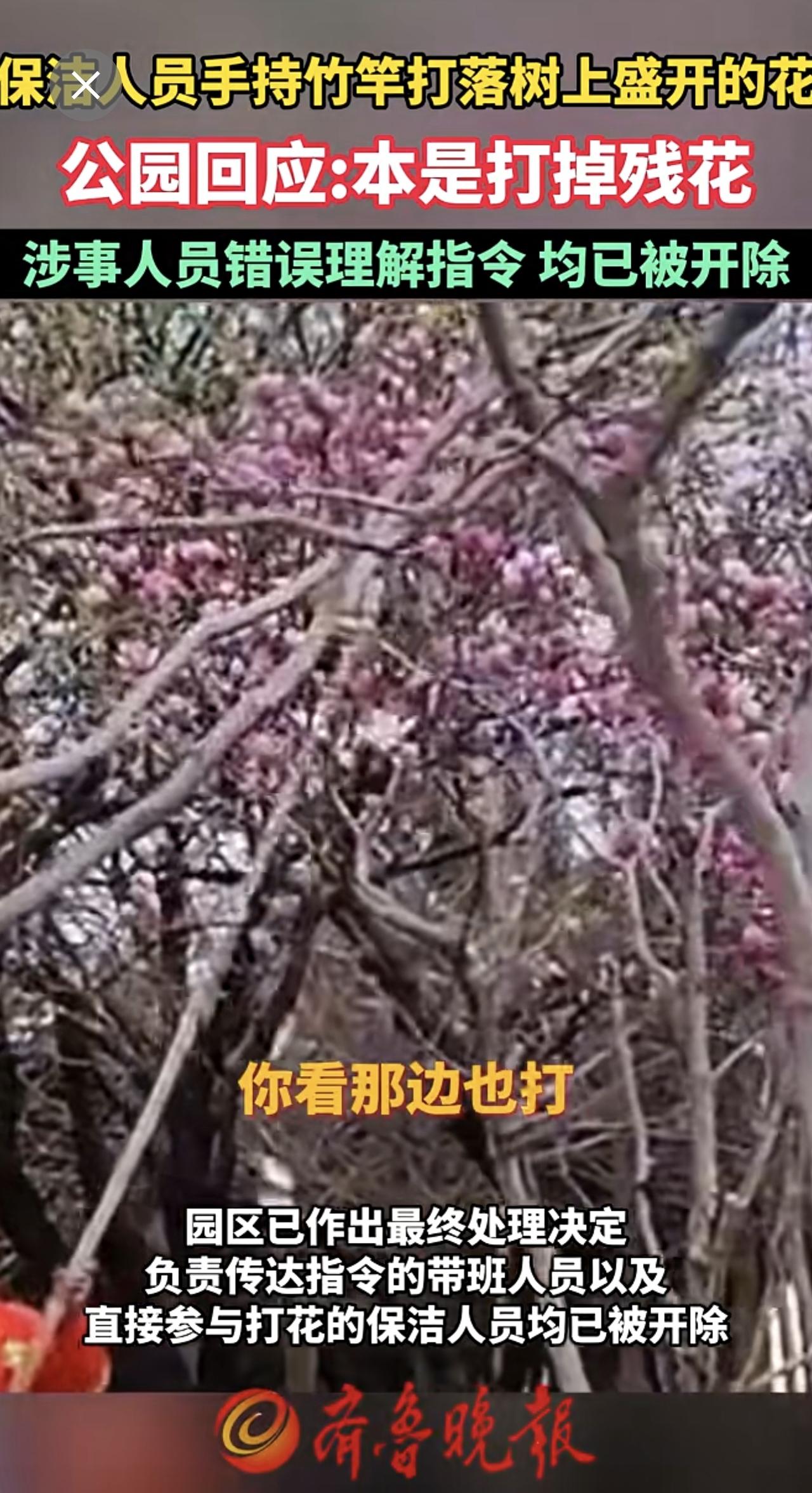 北京一公园保洁人员手持竹竿打落树上盛开的花,园方:涉事人员错误理解指令,均已被开除