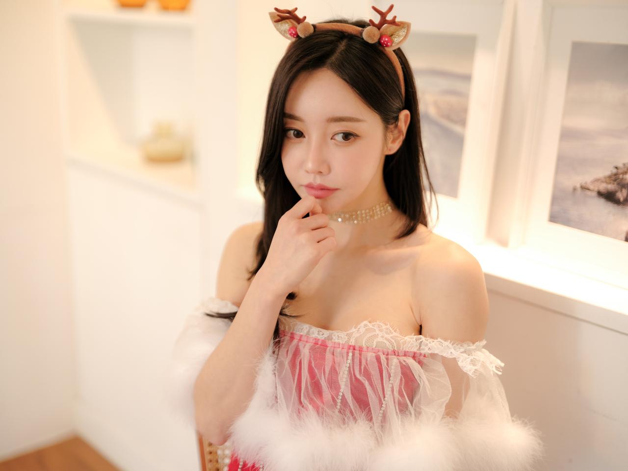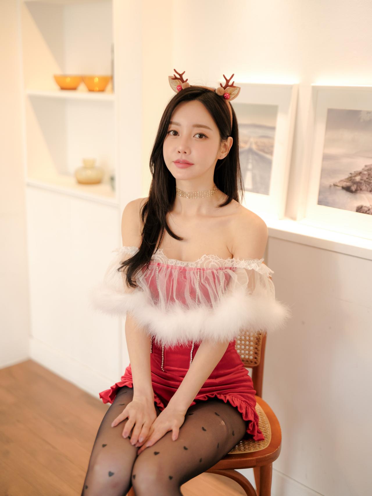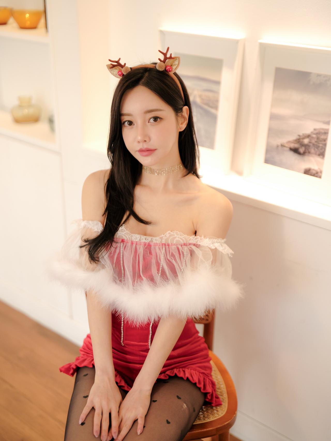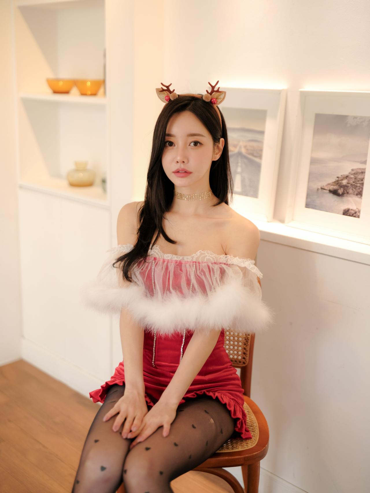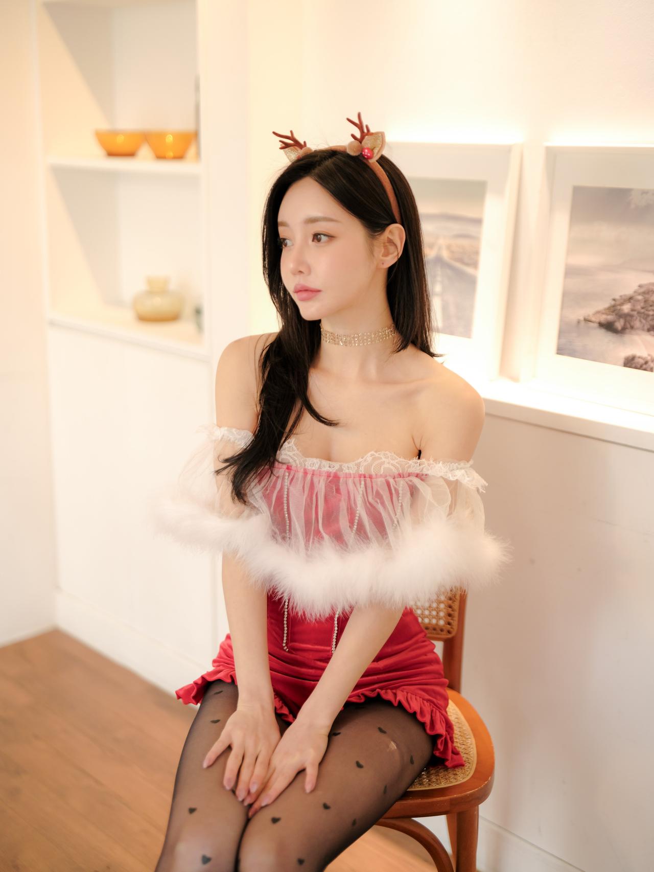 鹿头发饰映秋波,红衣美人似画中。