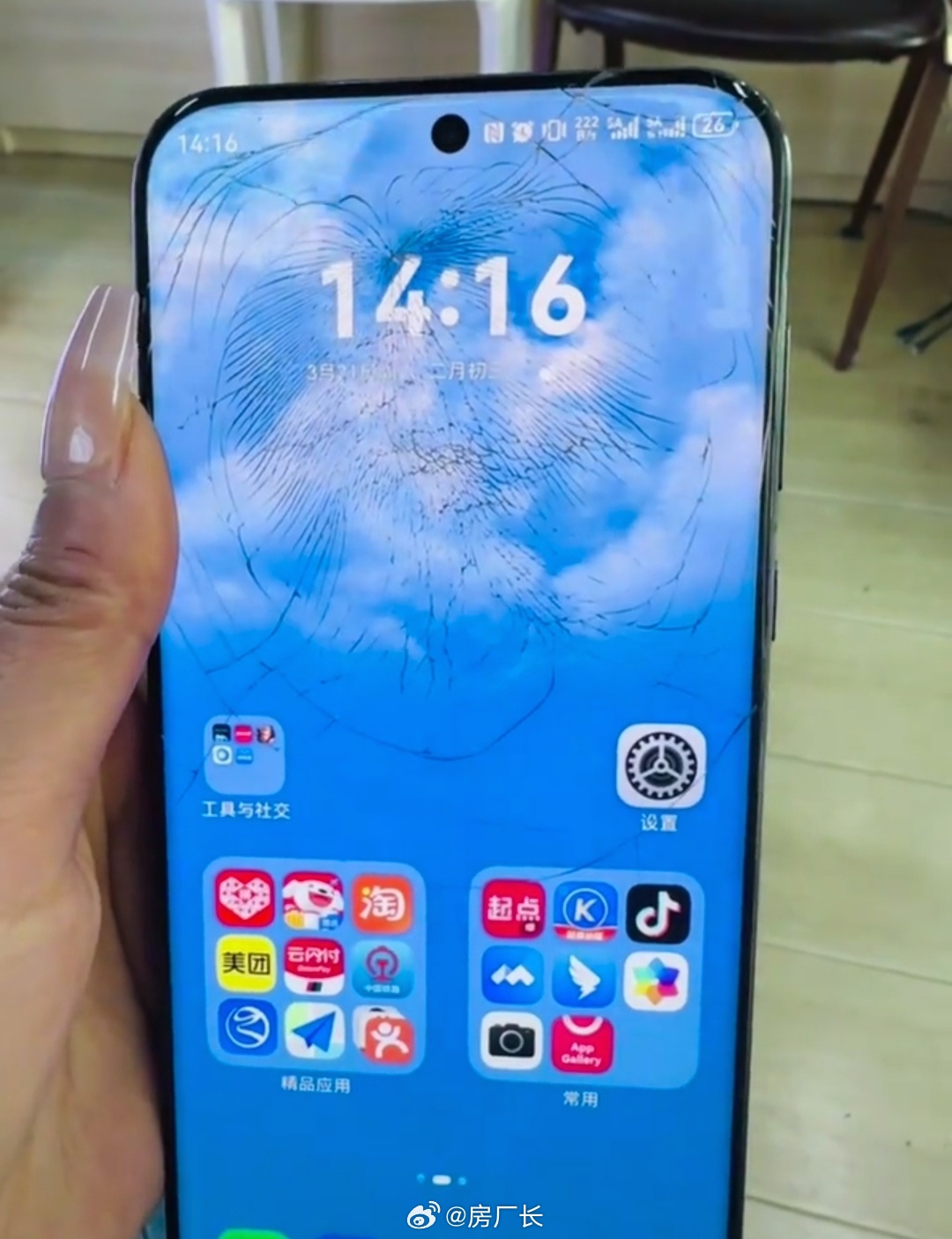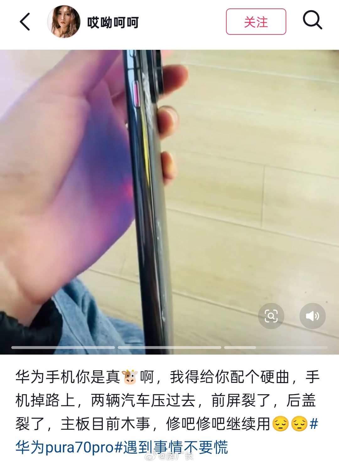 妹子的华为Pura 70 Pro被两辆车碾压,看起来就正反两面玻璃裂了,主板还能