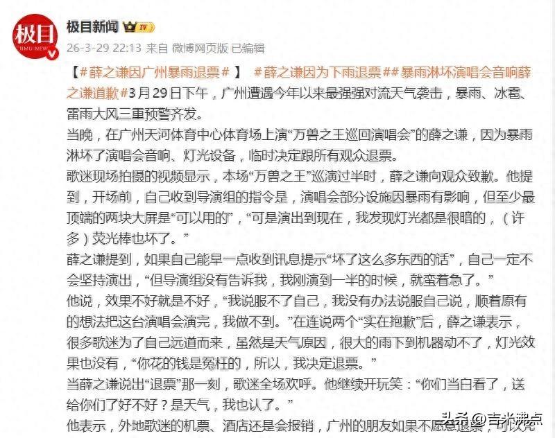 暴雨淹了舞台,设备全趴窝,他当场跪下鞠躬。 不是演的,是真没法继续了。 那天广州下的是冰雹加雷暴,手机天气APP直接弹出红色预警。薛之谦唱到一半,冰屏突然黑了,音响“滋啦”一声哑掉,连升降台都卡死不动。后台乱成一锅粥,三次确认,三次被告知“没法修”。他没喊暂停,也没让观众干等,自己走到台前,说了句“对不起,今天真不行了”。 退票不是口号,是立马开系统。看半场也退,连带外地来的车票、酒店发票,扫一下就到账。我朋友从海口飞过去,两千六的机票,第二天手机就收到全额转账。雨衣发了三万件,不是超市那种薄塑料,是加厚带帽的,后台采购单子都贴在官微评论区里了。 算下来亏一大笔。三万九千张票,均价一千七百多,光票房就没了近七千万。加上差旅报销、设备泡水报废、一千号人暴雨天照发工资,保守估计一个亿。没人逼他这么做,合同写得明明白白“不可抗力不赔”。但他还是赔了,而且赔得比条文细——连观众打车去机场的发票都收。 对比别的歌手,周杰伦上海那场雷雨,只发个延期通知;张学友北京站换场地,观众自己找酒店。这次没一个人说“算了”,反而好多粉丝转头买了下一场——成都场预售破纪录,连带衡阳、衢州两个小城市,那周文旅收入翻了一倍多。 《北青娱见》说“暴雨浇垮设备,却点亮艺德灯塔”,这话有点绕,但我听懂了:他没靠特效、没靠AI换脸,就靠站着说话算数。 跪下那一瞬间,镜头晃得厉害,但没剪掉。他膝盖沾了水,话筒声有点抖,但每个字都听得清。 万兽之王的加冕礼,不在灯光最亮的时候,而在所有灯都灭了,他把观众当人看。 他起身走了,没再回头。