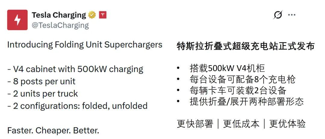 特斯拉上新“折叠式超级充电单元”,部署提速2倍、成本降低20%