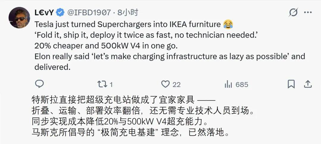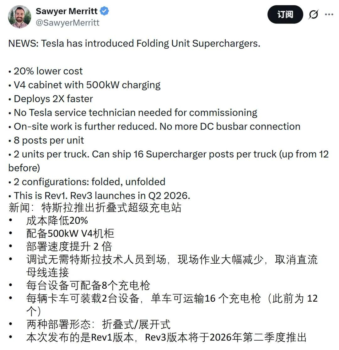 博主“SawyerMerritt”补充了更多细节,如该折叠式超级充电单元摒弃了传统连接方式,现场布线工作量大幅减少,进一步降本增效。