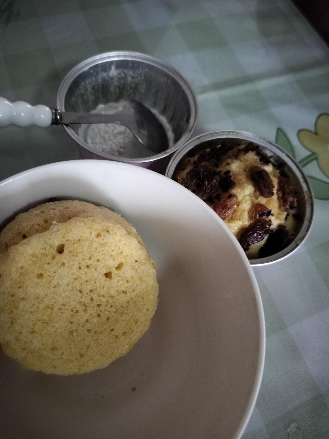 也不知道是成功还是失败,又是在网上视频跟别人学做的。小米山药鸡蛋糕, 人家要求小米200克, 山药150克,鸡蛋两个, 牛奶100克,酵母三克, 高筋面粉200克, 小米要泡一宿, 然后小米跟鸡蛋还有山药在破壁机里打成糊糊, 倒到碗里,加上酵母, 加上白砂糖跟牛奶, 然后放上面粉,调成面糊, 他们在烤箱38度发酵半小时,我在锅里用热水泡了, 发酵了40分钟,最后排气, 然后放到了模具里, 又二次醒发, 再上锅蒸25分钟。 我没有称重, 就按自己的感觉放的牛奶放多了,面粉放多了, 所以蒸出来不是金黄的, 有点儿发白了, 算是个半成品。 看来比例还是很重要呀!