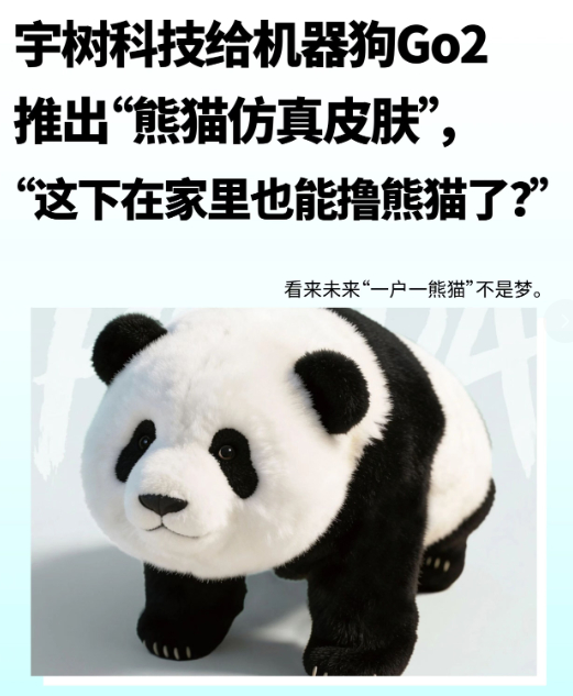 机器人也有“手机壳”了 宇树科技给自家 Go2 机器狗上新了一套“熊猫仿真皮肤”,目前已开启预售,定价3500元。比起原来的金属外观,套上皮肤后,作为“赛博宠物”的Go2 ,这只“赛博熊猫”还能实现专属动作。这下未来空间打开了,机器壳套上之后,你想要啥动物都可以哈哈哈