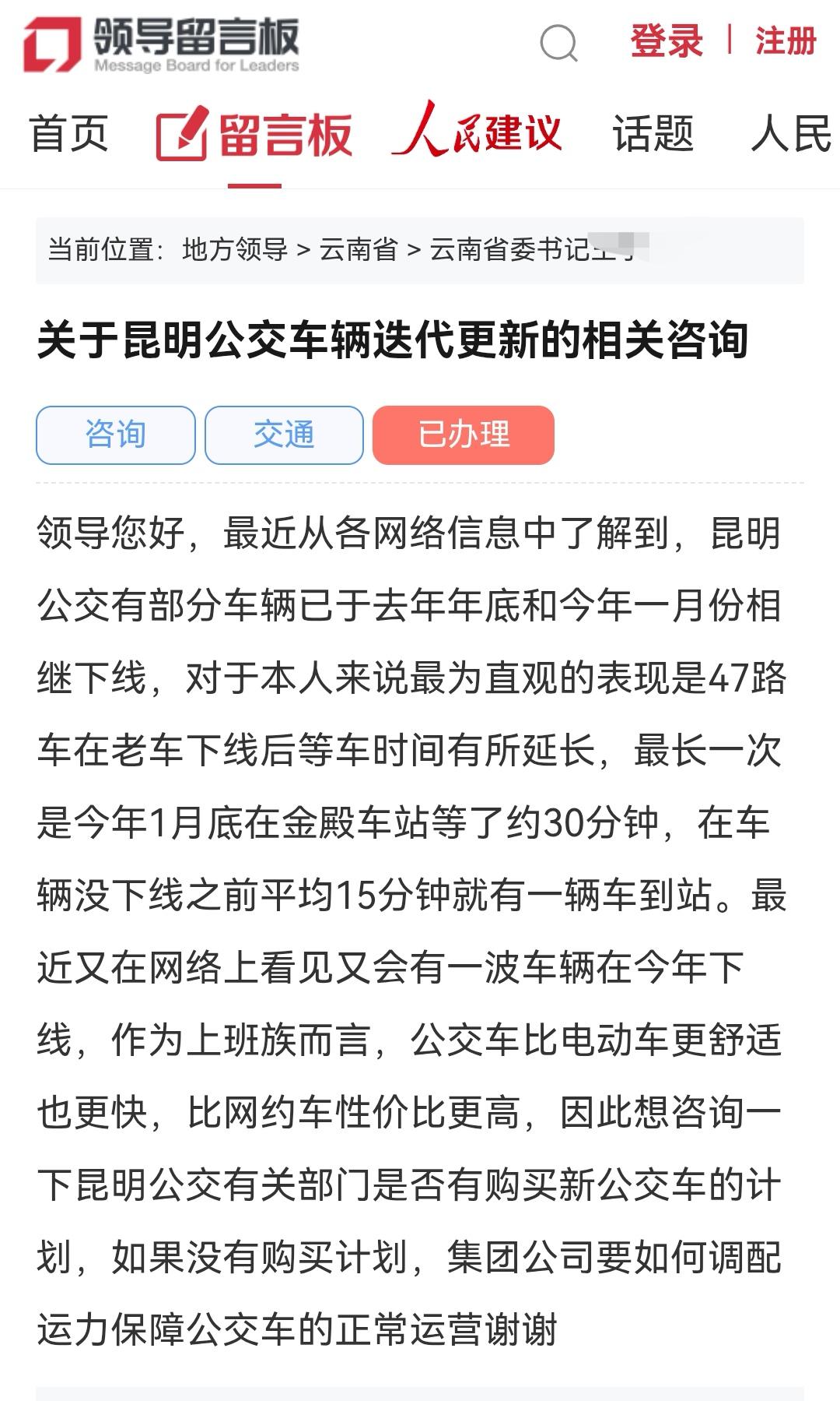 网民向云南省委书记咨询关于昆明公交车辆迭代更新的相关情况 ✍📥📨3月1日昆明网民通过人民网领导留言板给云南省委书记的留言: 📍关于昆明公交车辆迭代更新的相关咨询 领导您好,最近从各网络信息中了解到,昆明公交有部分车辆已于去年年底和今年一月份相继下线,对于本人来说最为直观的表现是47路车在老车下线后等车时间有所延长,最长一次是今年1月底在金殿车站等了约30分钟,在车辆没下线之前平均15分钟就有一辆车到站。最近又在网络上看见又会有一波车辆在今年下线,作为上班族而言,公交车比电动车更舒适也更快,比网约车性价比更高,因此想咨询一下昆明公交有关部门是否有购买新公交车的计划,如果没有购买计划,集团公司要如何调配运力保障公交车的正常运营谢谢 2026-03-23 19:00 📢📢📢昆明公交集团有限责任公司官方回复 网民同志:您好! 您通过人民网领导留言板的留言收悉,经昆明公交集团有限责任公司调查处理,现将有关情况回复如下: 一、昆明公交集团基本情况 截至2025年12月底,昆明公交集团运营体系成熟,共有常规公交线路280条,配车4151辆,日均运营里程达33万公里,日均服务乘客90万人次,为城市的公共交通出行提供了坚实支撑。 二、营运车辆报废情况说明 公交车辆的报废更新是昆明公交集团运营管理工作中的重要环节。依据相关法律法规和管理规定,公交车辆的强制报废年限为13年,达到使用年限的运营车辆必须进行强制报废。在2011、2012、2013年这三年期间,昆明公交集团集中采购了大批公交车辆,这些车辆在2024、2025、2026年陆续达到法定强制报废年限,需按规定进行强制报废处理,属于常规运营流程。 三、营运车辆更新计划安排 昆明公交集团始终将提升公共交通服务品质作为重要目标,已制定了科学合理的车辆更新计划。集团将紧密结合企业自身经营状况、客流结构特点、城市发展需求,以及城市公交与城市轨道交通的协调发展等多方面综合因素,拟更新一批公交车辆。具体的更新数量和车型选择,将严格按照规定报上级部门研究决策。在后续工作中,昆明公交集团将严格遵循法定程序,依法依规、有序推进车辆报废及更新工作,确保公交车辆的性能和服务水平能够满足市民日益增长的出行需求。 四、运力保障工作落实情况 昆明公交集团积极响应昆明市公交、轨道、慢行系统“三网融合”的发展战略,近年来在运力保障方面采取了一系列切实有效的措施: (一)打造品质公交线路:先后精心打造了42条品质公交线路,通过优化线路布局、提升车辆配置、加强服务管理等方式,为市民提供更加舒适、便捷、高效的公交出行服务。 (二)开行响应式公交线路:根据不同区域、不同时段的客流需求,开行了28条响应式公交线路。这些线路采用灵活的运营模式,根据乘客的实际需求安排车辆运行,提高了公交资源的利用效率,更好地满足了市民的个性化出行需求。 (三)开通社区微循环线路:为解决社区居民出行“最后一公里”问题,开行了34条社区微循环线路。这些线路深入社区内部,连接社区与周边的主要交通枢纽、商业中心、学校等,方便了社区居民的日常出行。 (四)保障校园公交出行:每学期为昆明市超过270所学校开行540余条校园公交专线,根据学校的作息时间和学生的出行需求,合理安排车辆运营时间和班次,保障了日均2.5万名师生的安全、便捷出行。 (五)加强公交地铁接驳:2025年,昆明公交集团开行了20条公交地铁高峰接驳专线,进一步优化了公交与地铁的接驳换乘衔接功能。通过合理设置接驳站点、调整运营时间等措施,实现了公交与地铁的无缝对接,方便了市民在不同交通方式之间的转换,提高了公共交通的整体运营效率。 上述各项工作均制定了周密的工作计划和运营组织计划,能够确保人民群众日常出行有充足的公交运力保障,让市民乘客出行无忧。 感谢您的理解与支持,顺祝身体健康、生活愉快! 昆明公交 公交车