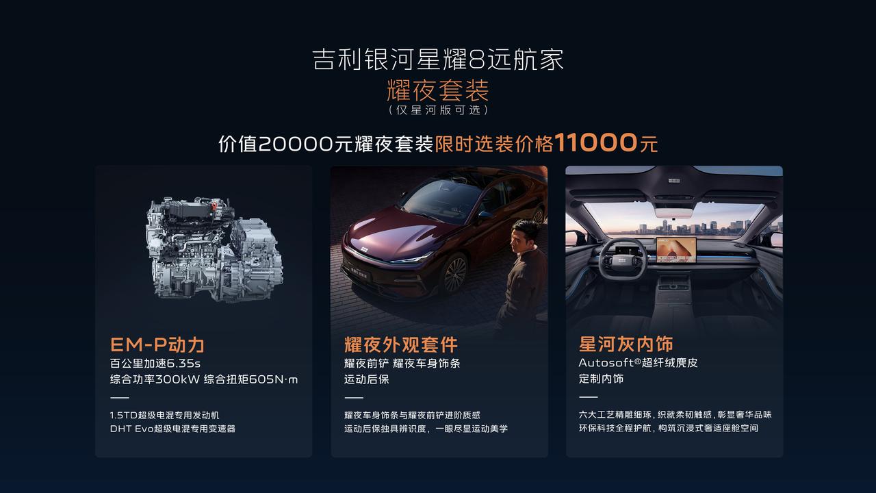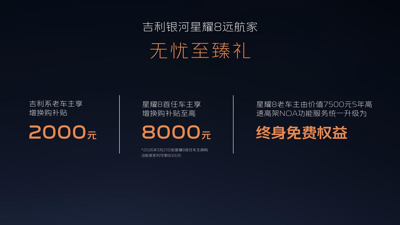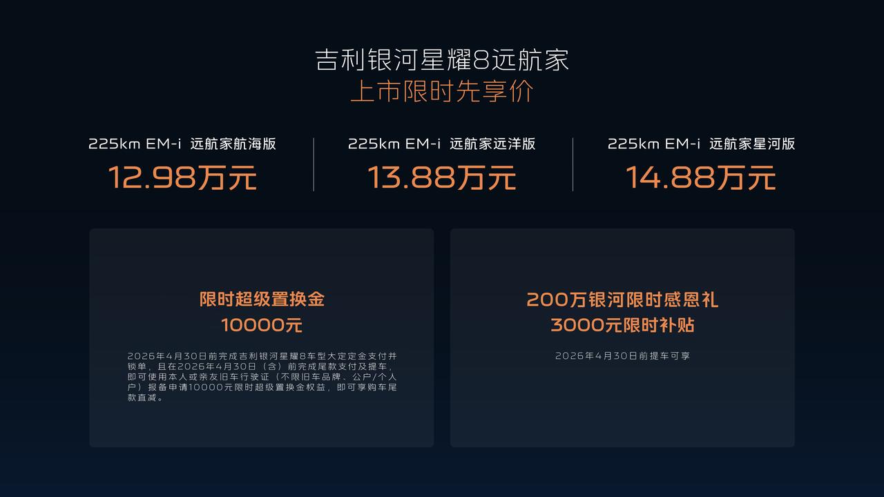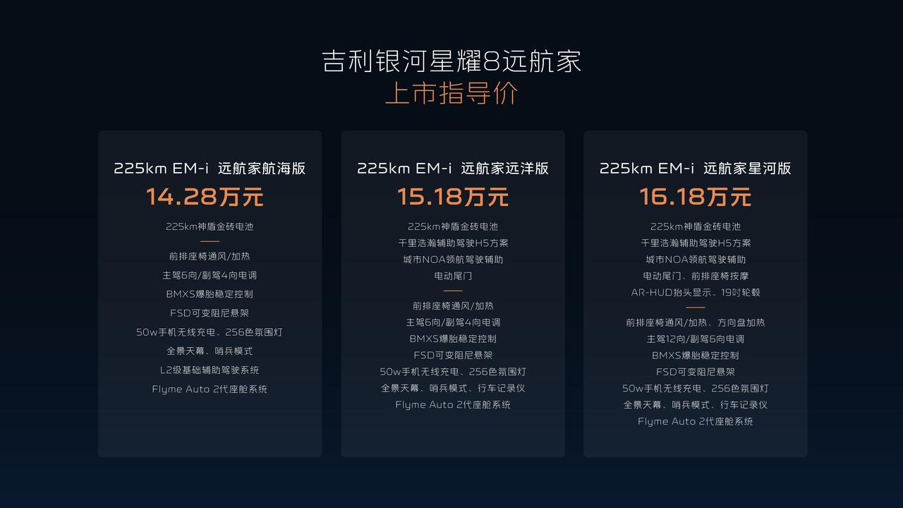 吉利银河星耀8远航家发布12.58万起。 当行业还在卷参数,银河星耀8远航家直接掀桌,225km纯电续航+1700km+综合续航,彻底解决里程焦虑;千里浩瀚H5智驾方案,27颗感知单元+城市NOA,激光雷达不再是30万专属。更狠的是安全冗余——160km/h爆胎稳定控制、130km/h紧急避让。还有23扬声器Flyme Sound、VIP电动行政座椅、丹霞矿/日照金专属车色……这次吉利对「科技豪华平权」的硬核诠释。