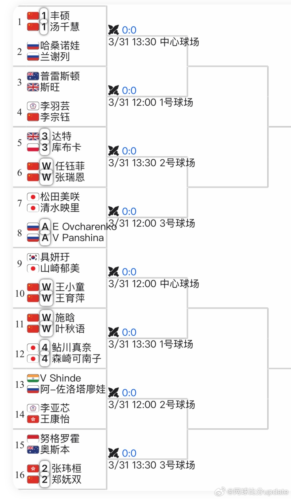 女双签表:🇨🇳 丰硕/🇨🇳汤千慧 1号种子出战。🇨🇳郑妩双/🇭🇰张玮桓2号种子