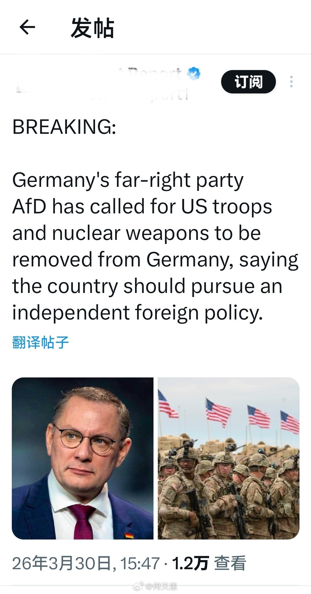 重大新闻:德国极右翼政党“德国选择党”呼吁美国军队及核武器撤出德国,并表示德国应