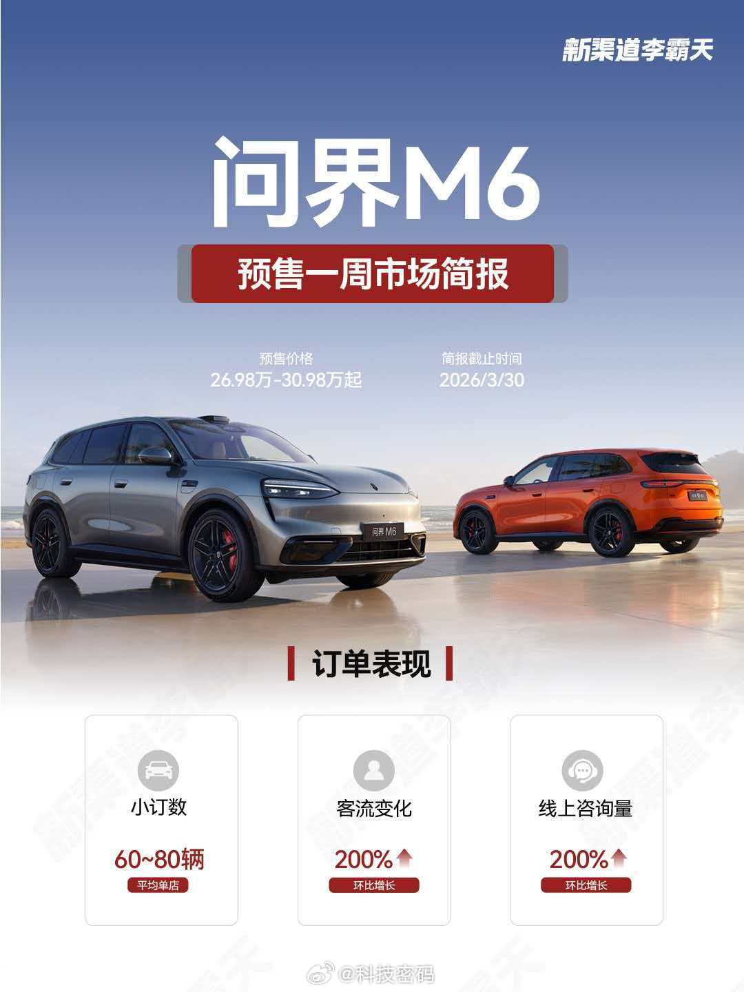 绝对爆款!问界M6平均单店小订60-80辆,其中问界M6小订纯电版订单近五成。问