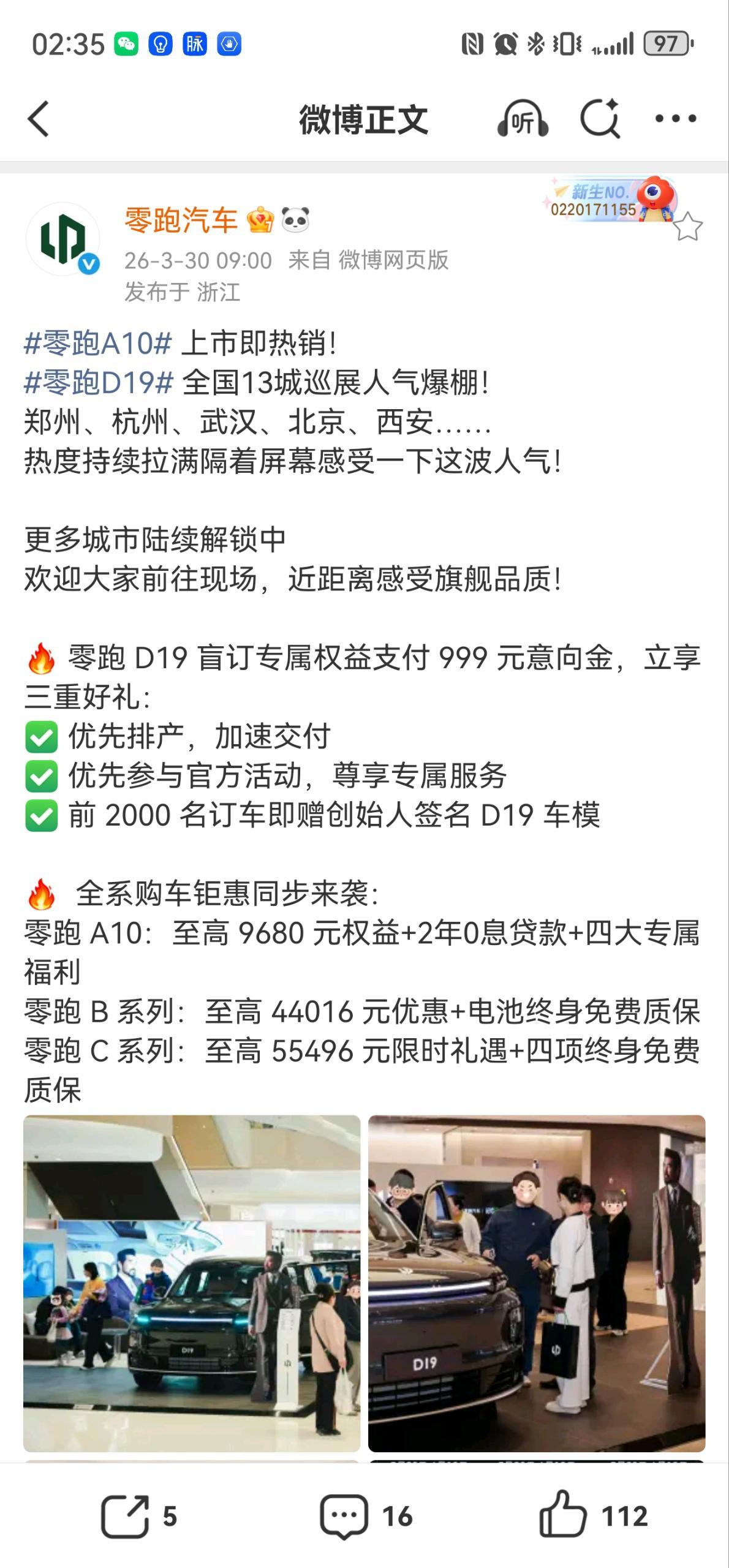 零跑订单又爆了!旗舰新车D19全国巡展人气拉满,4月16日重磅上市 零跑A10刚上市订单就爆了,全国60城巡展首发10城人气直接拉满——这台“很灵”的新座驾,看车的人排着队往里进。另一边D19全国13城巡展同步开启,展车周围人潮就没断过,不少人现场直接锁单。有人开玩笑:本来是奔着A10去的,结果被D19“截胡”了。从A10到D19,两头都在起量,零跑这波品牌势能直接拉满。 D19为什么这么火?底气在这: 十年全域自研,业界首个八合一电驱、CTC电池底盘一体化、四域合一中央集成式电子电气架构,全是行业首创。这些技术创新带来的效率提升,直接转化为用户能感知到的产品力——增程版纯电续航达500公里,行业首发的双SA8797舱驾一体芯片加持,端到端辅助驾驶大模型上车,车位到车位全程打通,好而不贵,就是这么来的。 市场数据也撑得住。零跑C10 2025年新势力中型SUV销量冠军,全年累计突破159000台,全球累计交付超24万台。海外同样第一:全球35国超800家渠道,2025年出口超6.7万台,欧洲十几个国家中国新势力销量榜,零跑全在榜首。 盈利更是不玩虚的。2025年净利润5.4亿元,中国第二家实现年度盈利的新势力,毛利率14.5%创年度新高,在手资金378.8亿元。Stellantis、一汽战略投资,创始人团队持续增持9.5亿港元,信心摆在那里。 最关键的是:零跑D19将于4月16日正式上市发布。现在全国13城巡展中,好车不怕等,好权益不等人,4月16日见真章。