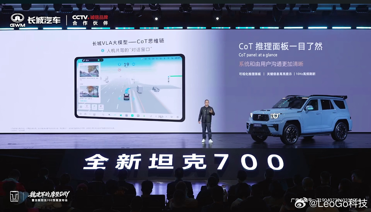 全新坦克700新时代新旗舰辅助驾驶方面,我觉得700真的在理解人!除了标配激光雷达+Coffee Pilot 4.0系统,支持城市NOA、融合泊车,V2A大模型实现全场景语音交互之外,主动理解环境,CoT面板也相当符合我们的视角,一目了然!