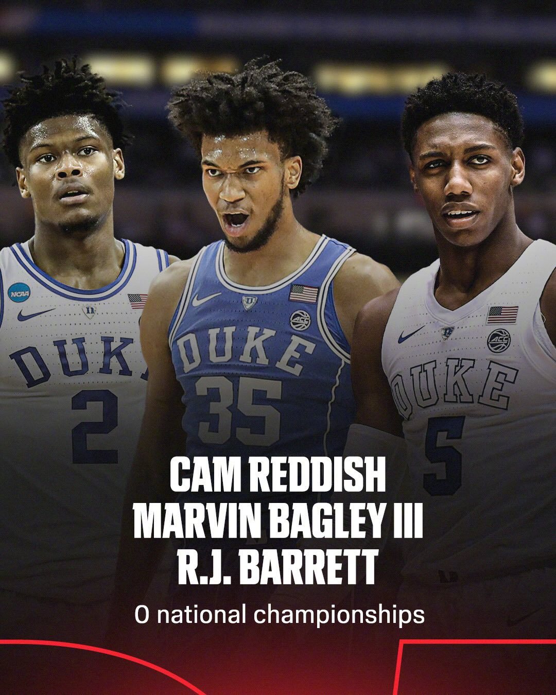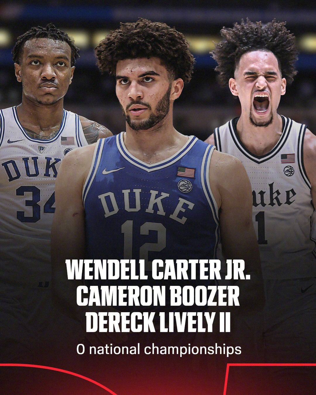 杜克大学上一次拿到疯三冠军还是2015年,在这之后进入杜克的这些球员都没能实现这