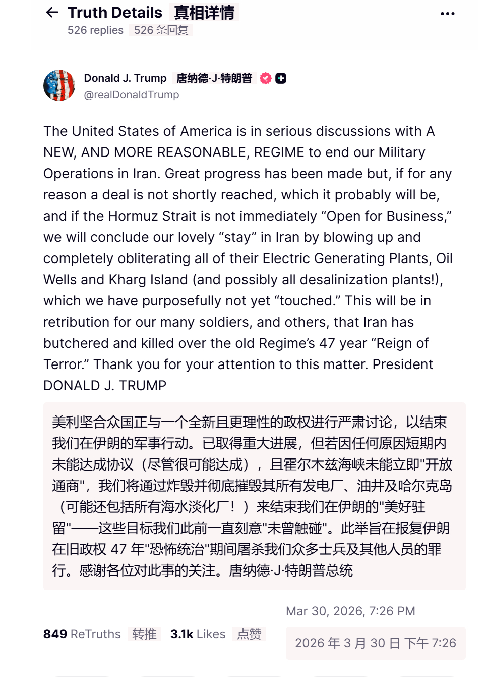 🔻特朗普发出新的威胁:“美利坚合众国正与一个全新且更理性的政权进行严肃讨论,以结束我们在伊朗的军事行动。已取得重大进展,但若因任何原因短期内未能达成协议(尽管很可能达成),且霍尔木兹海峡未能立即"开放通商",我们将通过炸毁并彻底摧毁其所有发电厂、油井及哈尔克岛(可能还包括所有海水淡化厂!)来结束我们在伊朗的"美好驻留"——这些目标我们此前一直刻意"未曾触碰"。感谢各位对此事的关注。唐纳德·J·特朗普总统。”🔻via realdonaldtrump特朗普说谈不成就炸岛伊朗海空联合打击美以多个目标海外新鲜事中东现场直击