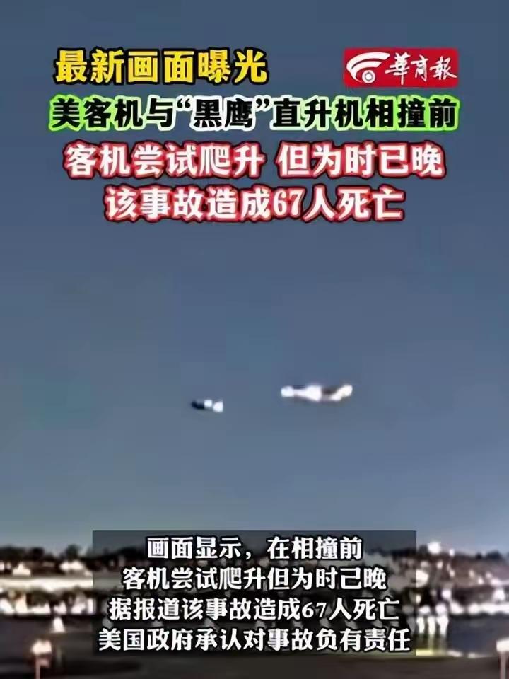 67 人遇难!美客机撞黑鹰直升机最后画面曝光,拉升避让全程被记录 3 月 30 日,美国哥伦比亚广播公司 CBS 披露了一段全新的事故视频,把 2025 年 1 月那场震惊全球的空难,再次拉回了大众视野。 视频里清晰记录了客机与黑鹰直升机相撞前的完整 13 秒,客机在最后关头疯狂拉起机头试图避让,可一切都为时已晚。 这段视频的曝光,不仅让人心头一紧,更引发了无数人的深思:在现代航空技术高度发达的今天,为什么这样惨烈的空难依然会发生?67条鲜活的生命,就这样在瞬间被无情夺走,背后到底隐藏着怎样的管理漏洞和制度缺失? 透过这段画面,我们看到的绝不仅仅是机械的碰撞,更是人性与制度的博弈。那架客机飞行员的最后挣扎,试图拉升避让的画面,令人揪心,也让我们不得不质问:为何两架飞行器会出现在如此危险的交汇点?空中交通管理是否存在盲区?监管部门的责任在哪里? 更令人愤怒的是,这起事故并非偶然。近年来,全球范围内空中交通事故频发,背后往往是监管松懈、信息沟通不畅以及商业利益驱动下的安全隐患被忽视。每一次悲剧的背后,都是对“安全第一”口号的背弃,是对乘客生命的不尊重。 然而,悲剧也让我们看到了人性的光辉。事故发生后,无数救援人员第一时间赶赴现场,冒着生命危险搜救幸存者;遇难者家属的坚强与社会各界的支持,展现了人类面对灾难时的团结与温情。这种力量,正是我们社会前进的动力。 我们不能让这场悲剧成为又一次无声的警钟。每一个关注此事的人,都应当发声,推动更严格的航空安全法规,更透明的监管机制。唯有如此,才能真正守护每一位乘客的生命安全,让“飞行”不再成为恐惧的代名词。 读者朋友们,你是否也为这场惨烈的空难感到愤怒和无奈?你是否想知道,事故背后究竟隐藏了多少不为人知的真相?欢迎在评论区留下你的看法,一起为航空安全发声,推动改变!这不仅仅是一次空难,更是我们每个人都不能回避的社会课题。客机遇难