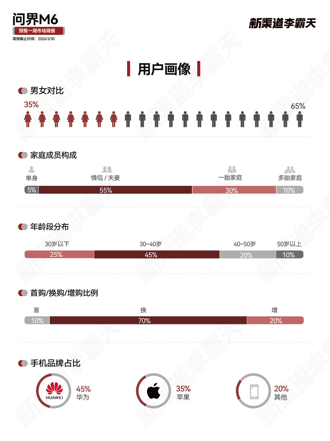 用户画像方面,问界M6近七成小订用户为90后,女性用户占比超35%,单身和年轻无孩家庭占比超60%,40%对比理想L6,i6,30%对比小米YU7,还有30%对比特斯拉modelY,都是该价位段的爆品。还有油车奔驰GLC哈哈