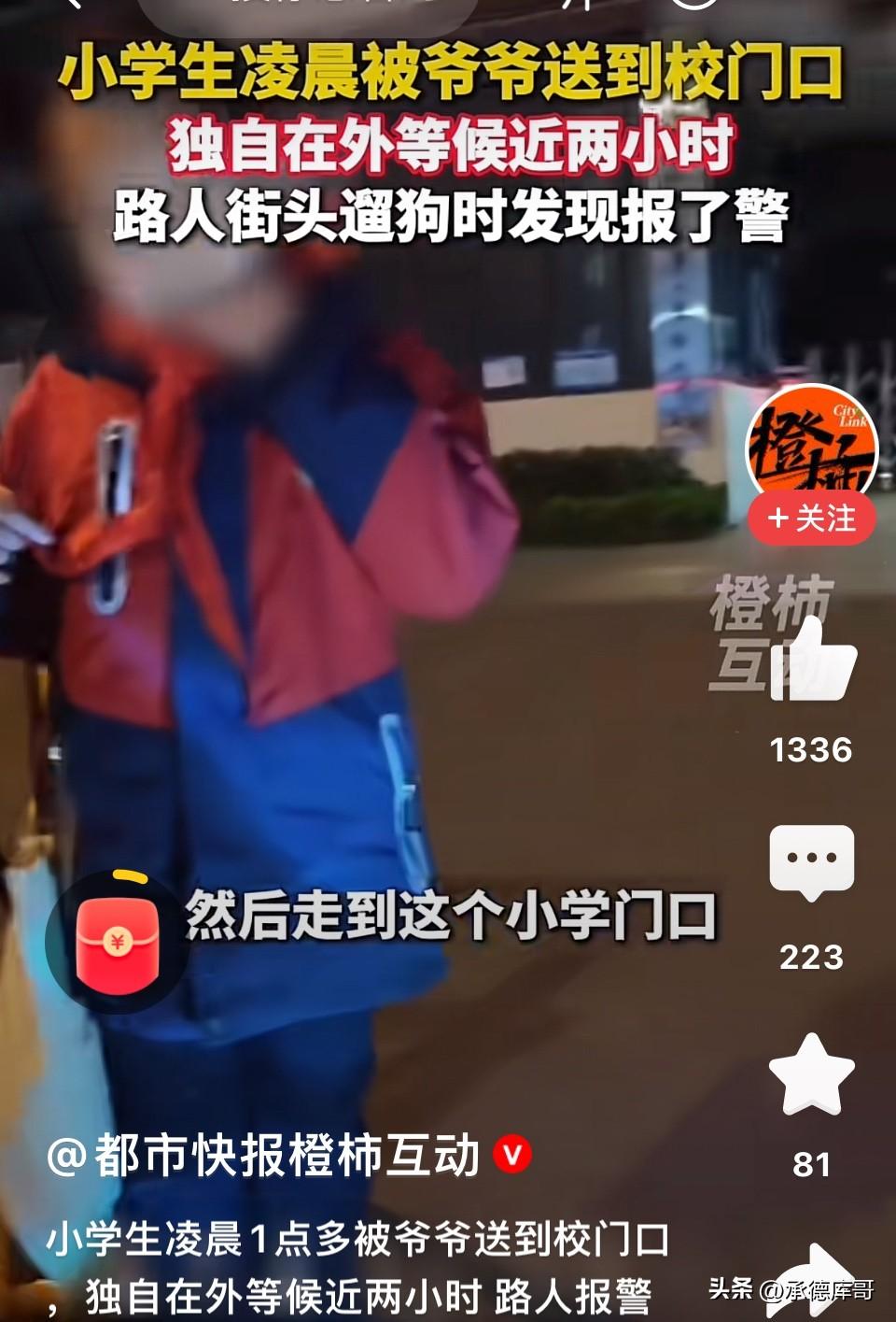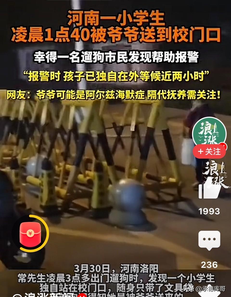 让人心酸!河南洛阳,80岁爷爷凌晨1:40就把孙子送到了学校,孙子在寒夜苦等2个多小时才被遛狗男子报警后送回家。网友:估计爷爷把1:40看成7:40了! 凌晨1:40夜还很黑,一个80岁的老人骑着三轮车,把上小学一年级孙子送到学校门口,然后转身离开。 孩子一个人站在漆黑的校门口,一直在等待学校开门,可是两个多小时过去了天还没有亮,更没有学生来到校园。 直到凌晨4点左右,一位遛狗的常先生经过,发现了这个独自在寒风中瑟瑟发抖的孩子。 男子赶紧上前询问孩子情况,得知是平时都是由爷爷奶奶照顾他的生活。是被爷爷送来上学的。 常先生便问了孩子爷爷的电话,想着联系孩子爷爷赶紧把孩子接回去。 还好孩子清楚的记得爷爷电话号码,常先生拨通了电话可是老人却糊里糊涂的也说不清楚,根本无法沟通。 常先生拨打了报警电话求助,警方很快赶到现场,在核实好孩子身份孩子后,警察将孩子安全送回了家。 事情曝光后,迅速在网上引发热议,有人说:“80岁的爷爷凌晨一点多送孙子上学?这时间点也太离谱了吧,是爷爷记错了时间还是孩子搞错了?” 也有人质疑:“孩子的父母呢?为什么是80岁的爷爷在照顾孩子?这么大年纪了,自己都照顾不好自己,还要操心孙子的上学问题。” 还有人心疼孩子:“大半夜的,一个13岁的孩子在黑漆漆的校门口站了两个多小时,得多害怕啊。幸好遇到好心人,不然后果不堪设想。” 更有人直接开骂:“这当爷爷的是不是糊涂了?凌晨一点多把孩子扔学校门口,自己回家睡觉?沟通还无果,这是对孙子不负责任!” 在这件事里,我们与其去指责一个80岁的老人,不如去思考更深层的问题。 80岁,本该是儿孙绕膝、安享晚年的年纪。可他还在深夜里骑着三轮车送孙子上学。为什么?因为孩子的父母不在身边。 这背后折射出的,是无数农村家庭的真实写照:父母外出打工,孩子留给年迈的老人照顾。老人年纪大了,记性差了,甚至有些糊涂了,但他们依然在拼尽全力地“扛”着。 凌晨1:40,这个时间点,爷爷可能是真的记错了。也许是老人家把时间听错了、记混了,也许是孩子说了什么让老人误解了。但你能说他不爱孙子吗?一个80岁的老人,大半夜不睡觉,骑着三轮车送孩子去学校,这份心意,让人泪目。 最让人心疼的是那个孩子,正是需要父母陪伴的年纪,可他没有。他跟着80岁的爷爷生活,凌晨一点多被送到学校,发现学校没开门,他没有手机,联系不上爷爷,只能一个人站在黑暗里等,等了两个多小时。 他害怕吗?肯定害怕。 但他能怎么办?他没有别的选择。 我们总说“隔代亲”,可“隔代亲”的背后,是多少老人的力不从心,是多少孩子的孤单无助。 这样的故事不应该只被当成一个“乌龙事件”来消费。它应该让更多人看到——在那些我们看不见的地方,还有很多老人和孩子,正在艰难地生活着。 他们需要的,不是我们键盘上的指责,而是实实在在的关注和帮助。 愿每一个深夜等待的孩子,都能被温柔以待。愿每一个白发苍苍的老人,都不必在寒夜里奔波。