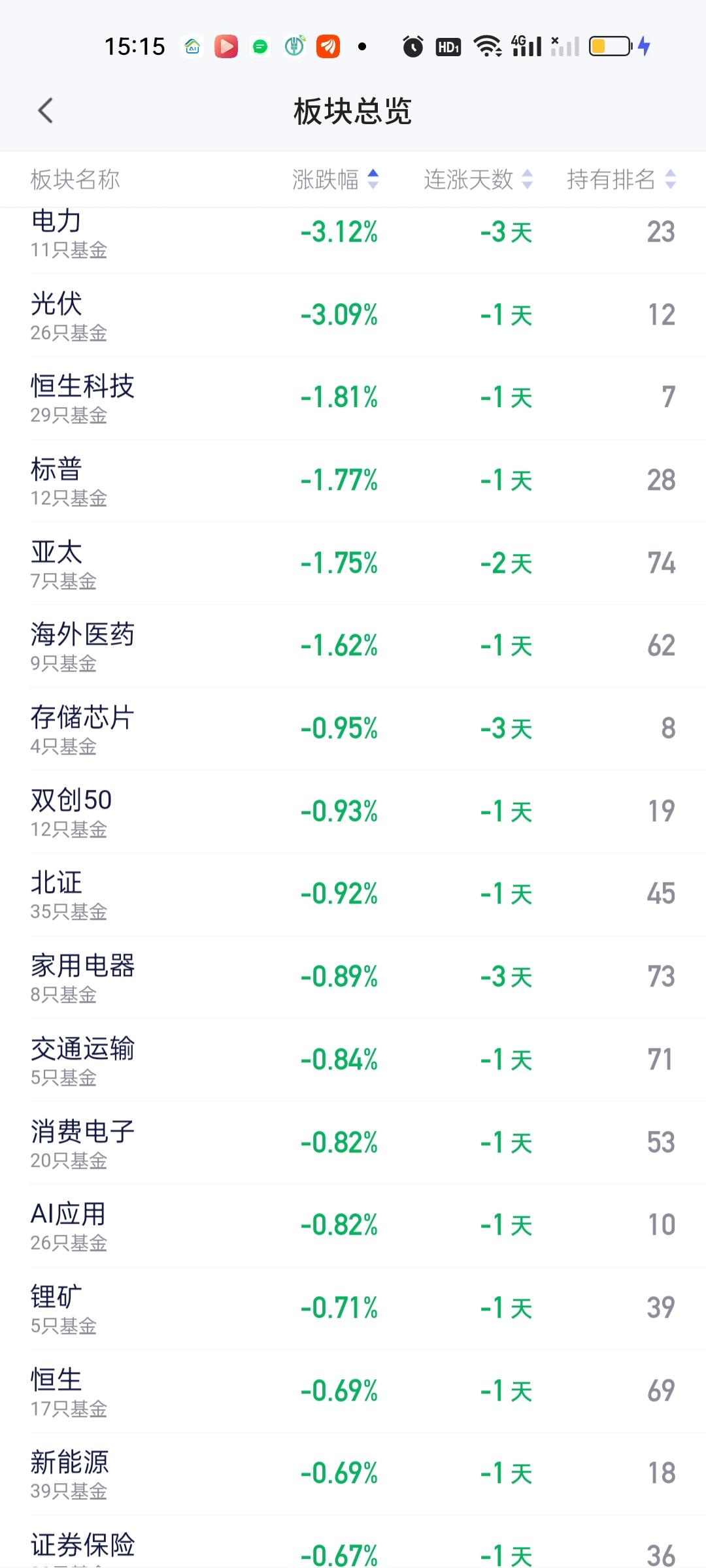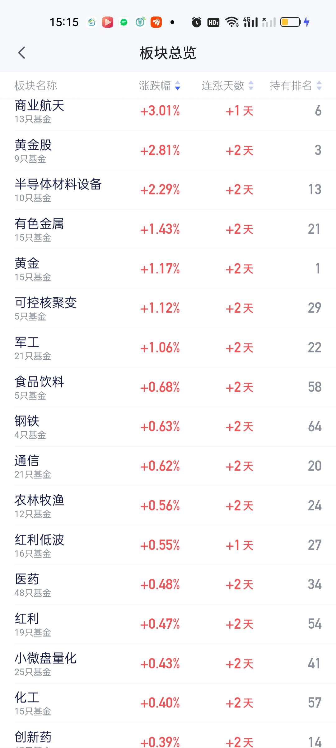 收盘了,和上午收盘一样,涨幅最大的板块是商业航天,涨幅3.01%,这也是今天唯一一个涨幅在3%以上的板块。除此之外,黄金股和半导体材料设备分别上涨了2.81%和2.29%,涨幅在1%以上的板块有有色金属1.43%,黄金1.17%,可控核聚变1.12%,军工1.06%,其它板块涨幅都在1%以下。 跌幅方面,电力和光伏跌幅在3%以上,分别跌了3.12%和3.09%,恒科目前跌1.81%但目前并没有收盘,最后跌多少还说不好。标普,亚太和海外医药跌幅在1%以上,其它板块跌幅都在1%以下。
