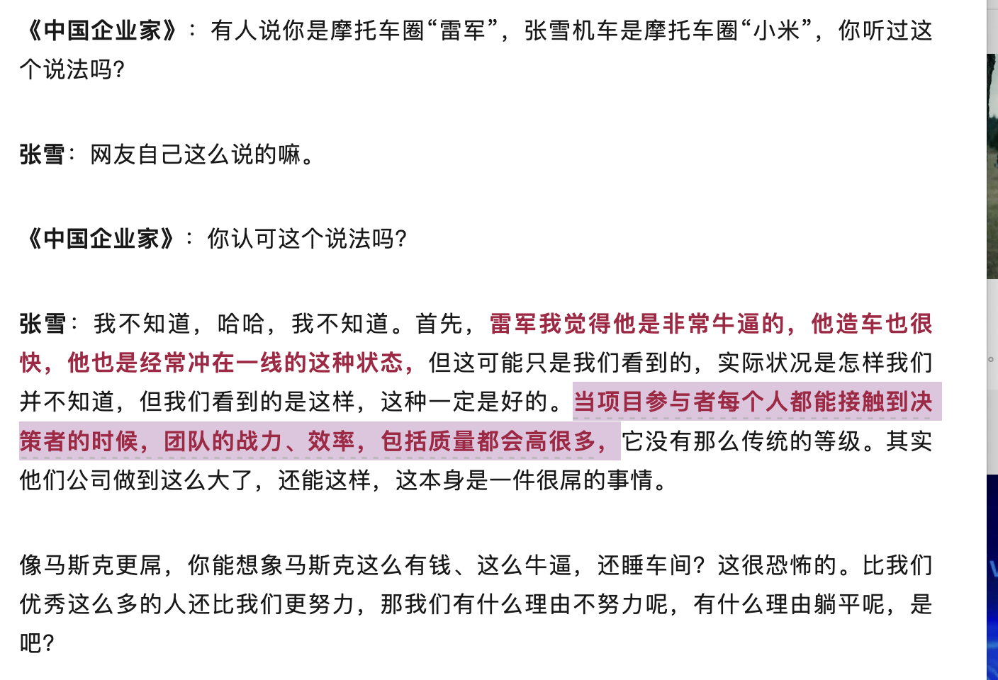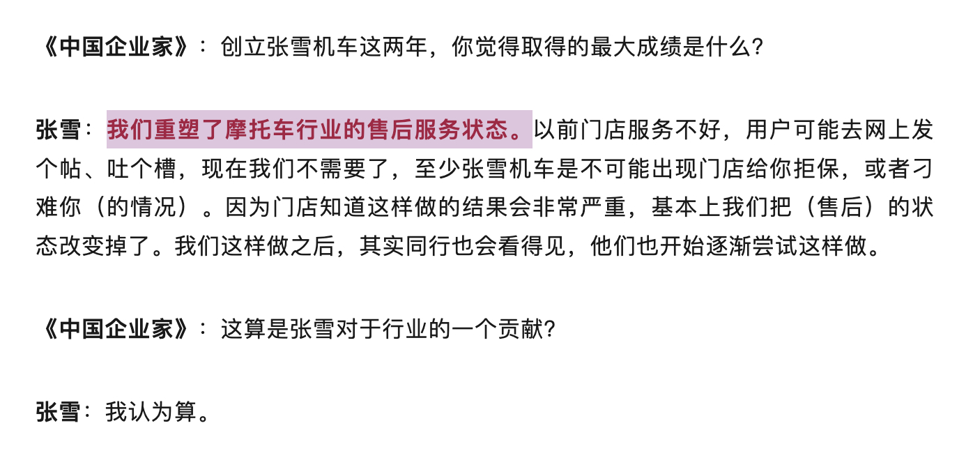 在接受采访时,张雪主动谈起了,如果说一定有什么类似之处,那么一个创业者能一直伫立在一线,将会大大提高公司运转和决策效率。