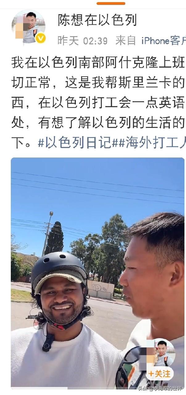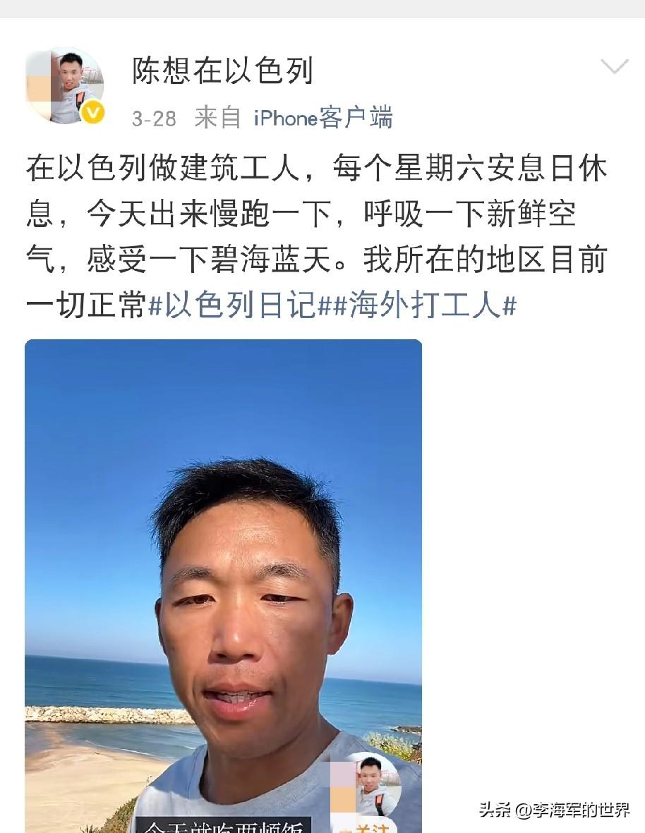 28号注册,一共三个帖子,中心意思就一个,以色列这边风景独好,安然无恙,没有外界说的那样“惨”,遭伊朗导弹打击的惨样。 好吧,你在以色列,你说的对。 我想问的一个问题是,既然以色列像你说的那么好,风景独好。 那以色列驻华使馆在微博上发文卖惨,算不算造谣? 你都拍视频说了,以色列这边很好,平安无事。 那以色列卖惨,就是纯粹造谣了。 真不明白这类人,你说你一个中国人,在以色列只是个打工的。你掺和进这个事,想干啥?