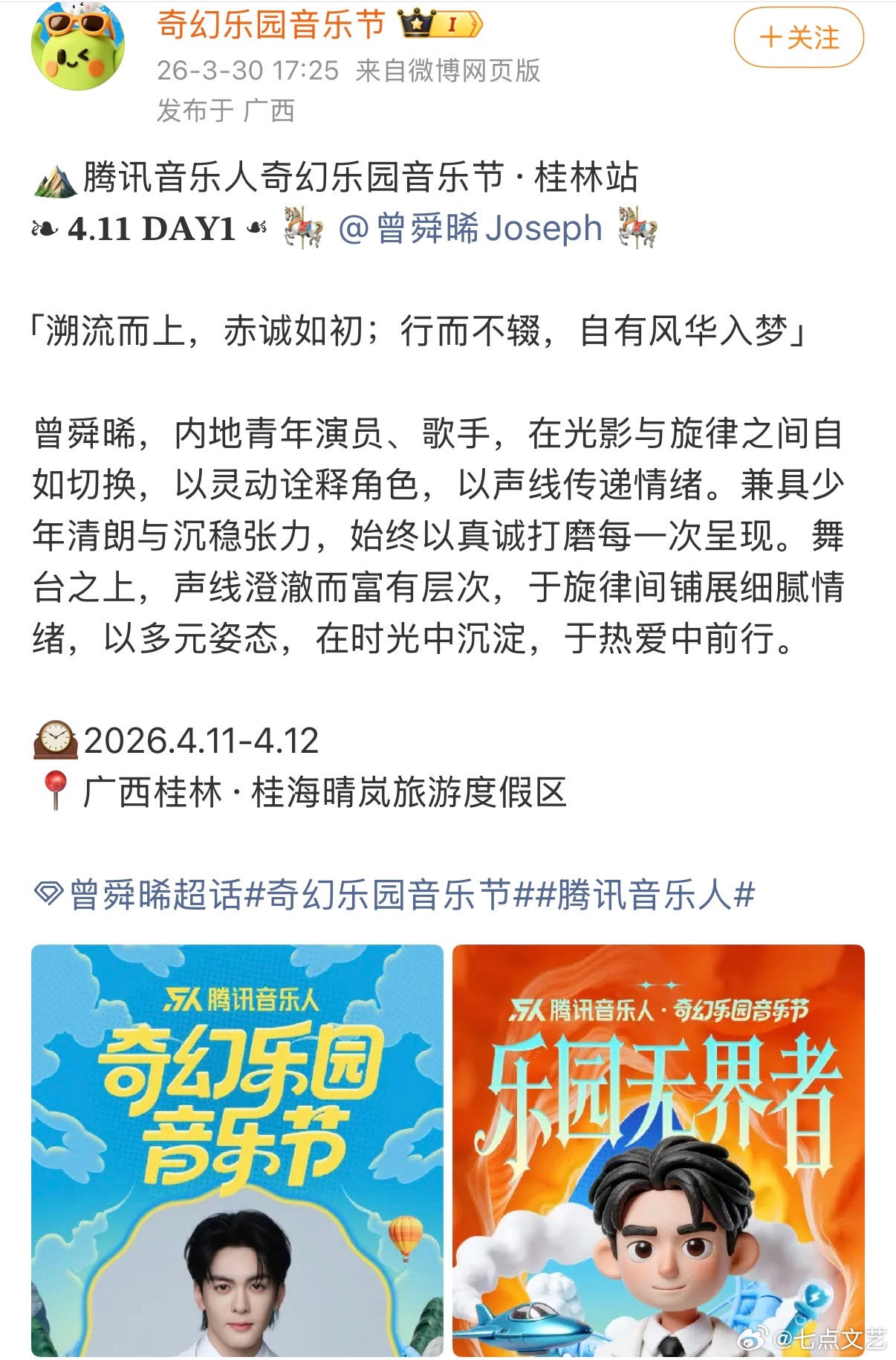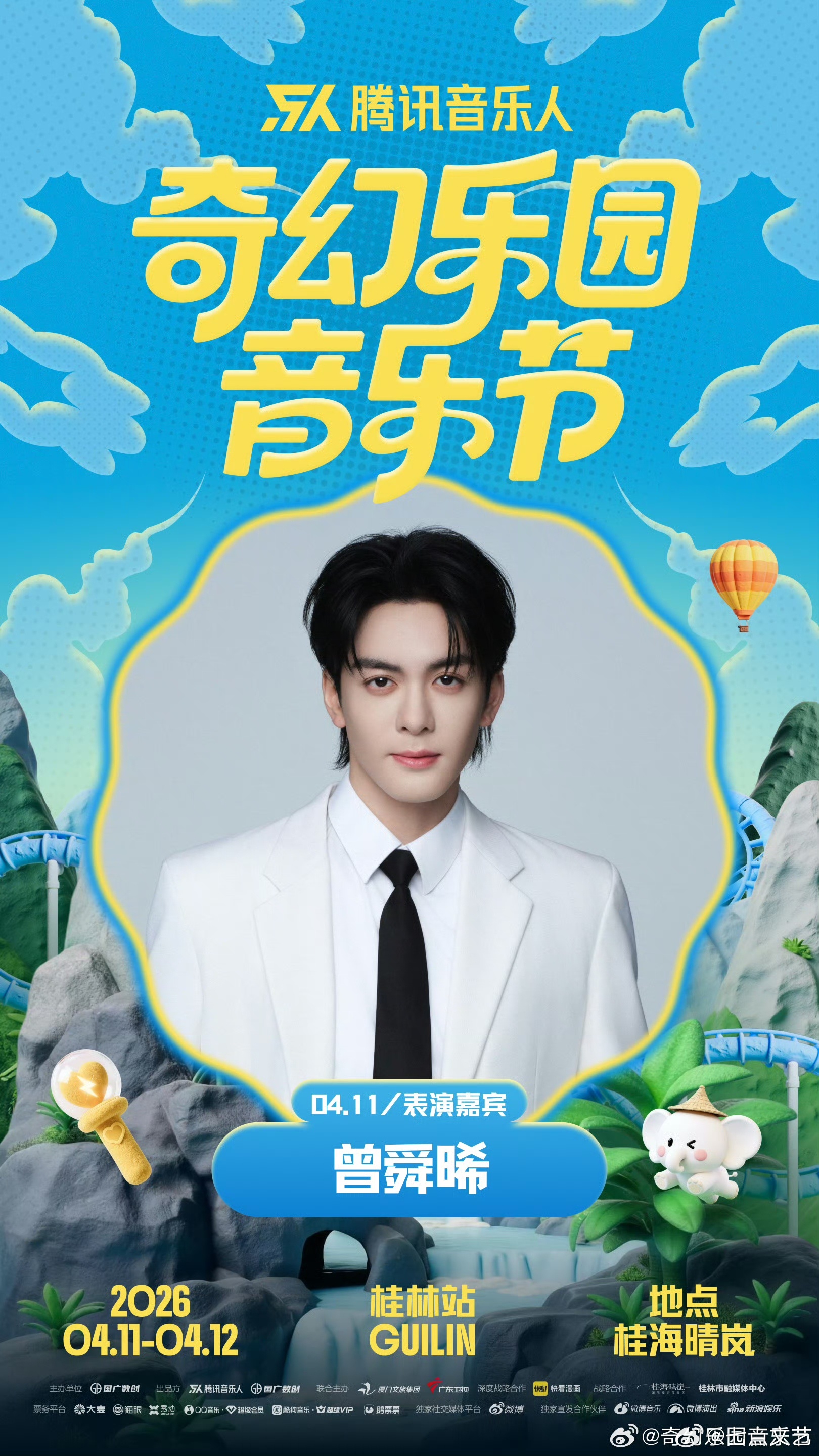 奇幻乐园音乐节官宣曾舜晞曾舜晞重磅加盟奇幻乐园音乐节桂林站。他声线清澈富有质感,舞台形象亮眼,表演极具亲和力。他将用歌声传递热爱,点亮桂林音乐现场。