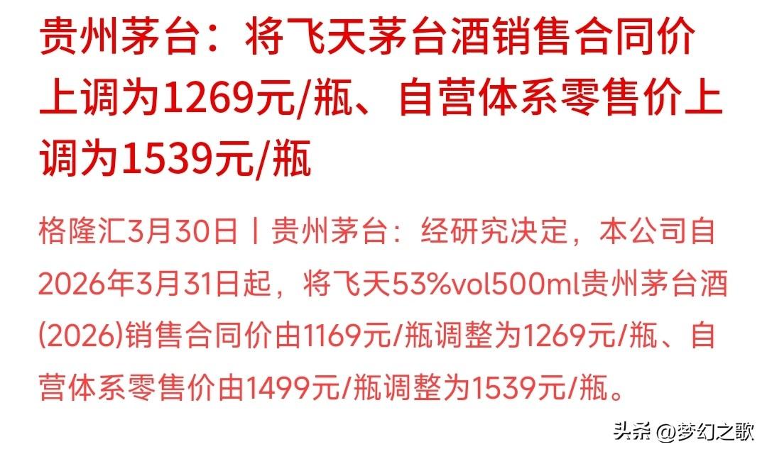 白酒板块这是怎么了,整体不涨就算了,利空还不断 2025年白酒就暴雷,业绩不好,2026年一季度的业绩更弱,让白酒板块一跌再跌,不只机构在逃就连散户都跑的差不多了。 今天晚上又爆出龙头的利空消息,人事变动虽然哪个公司都有,但是好的公司不好频繁的免去高管的职务的,这就让投资者怀疑其稳定性了,毕竟茅台在很多年里都是投资者首选的目标。 不过今天晚上茅台也有好的消息传出来了,不管是合同价还是零售价都出现了上调涨价,这对于茅台以及整个板块来说是一个刺激反弹的消息。