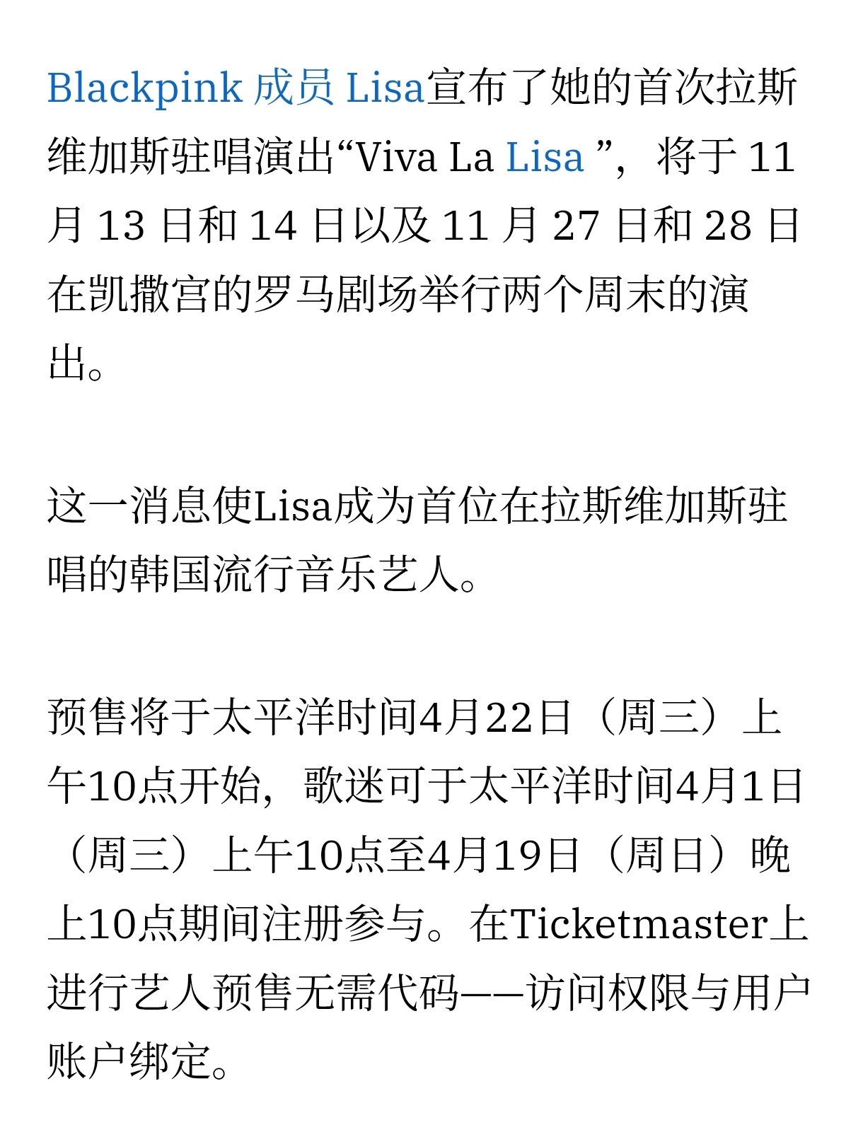 💥卧槽!!!!!根据Variety独家报道,Lisa将在拉斯维加斯举办名为“VIVA LA LISA”的驻唱音乐会,这使她成为首位在拉斯维加斯驻唱的K-Pop艺人🔥演出将于 2026年11月13日和14日以及27日和28日在凯撒宫的罗马剧院举行两个周末的演出!我靠啊来了来了!!!!!