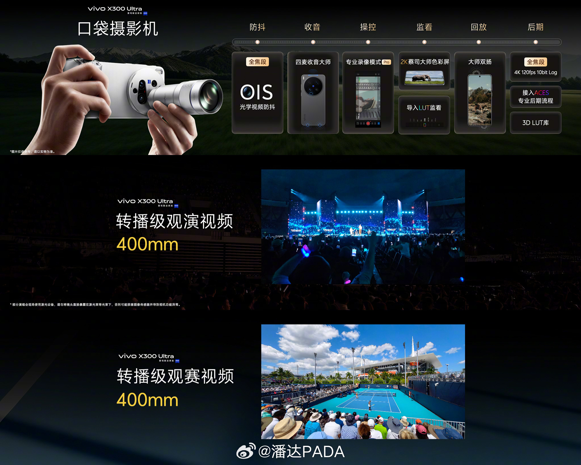 vivo X300 Ultra视频能力:全焦段高规格,支持运动侦测对齐、AI降噪及4K 120fps杜比视界直出;全链路专业工作流,配备Log模式、OIS防抖、四麦克风及3D LUT支持,适配ACES后期流程;转播级表现,蔡司增距镜实现远摄稳定,四麦克风精准收音,清晰捕捉演唱会与体育赛事细节。vivo x300 ultra专业v单