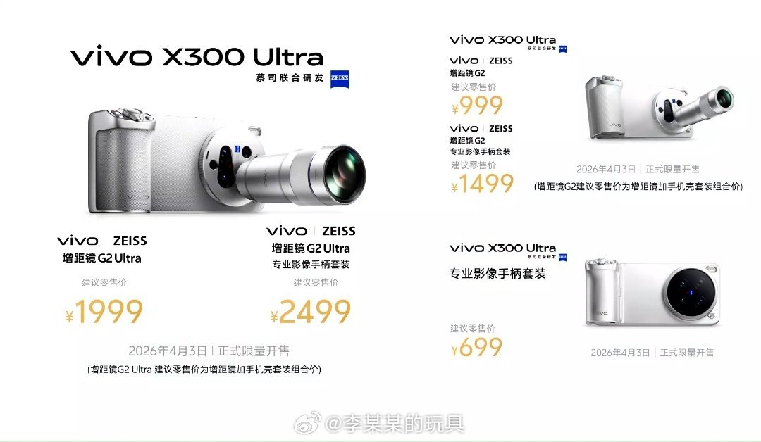 vivo X300 Ultra价格:起售价6999元;增距镜G2 Ultra价格1999元,搭配手柄2499元;顶配全家桶11999元。这个价格还买啥相机vivo x300ultra专业v单vivo发布会