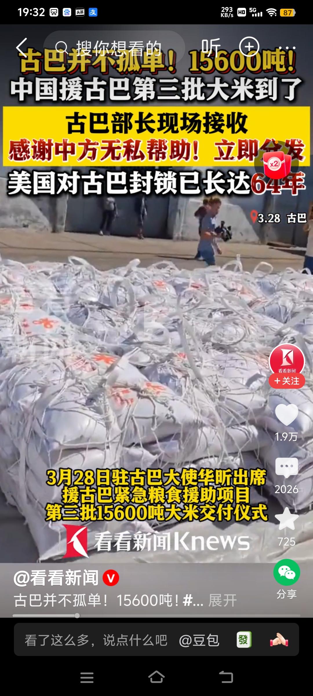中国自己每年都还要进口大量大米才够吃,但依然给挨饿的古巴援助大米。 3月28日,中国今年紧急援助古巴的第三批大米15600吨交付。古巴内贸部部长迪亚斯现场接受,并感谢中国人民的无私援助。 今年1月中国紧急援助古巴大米3万吨,3月份援助古巴大米6万吨,两个月内援助大米达9万吨。 但愿古巴记住中国人民的这份深情厚谊,因为中国人民自己的大米都不够吃,每年都需要从外国进口大米才行。 从2022年到2025年,中国平均每年从外国进口大米近340万吨,2025中国就进口了大米310万吨。 真的希望古巴吃了中国援助的这些大米后,不要忘恩负义,像委内瑞拉一样投靠美国后,赖着中国100亿美元的债务不还。