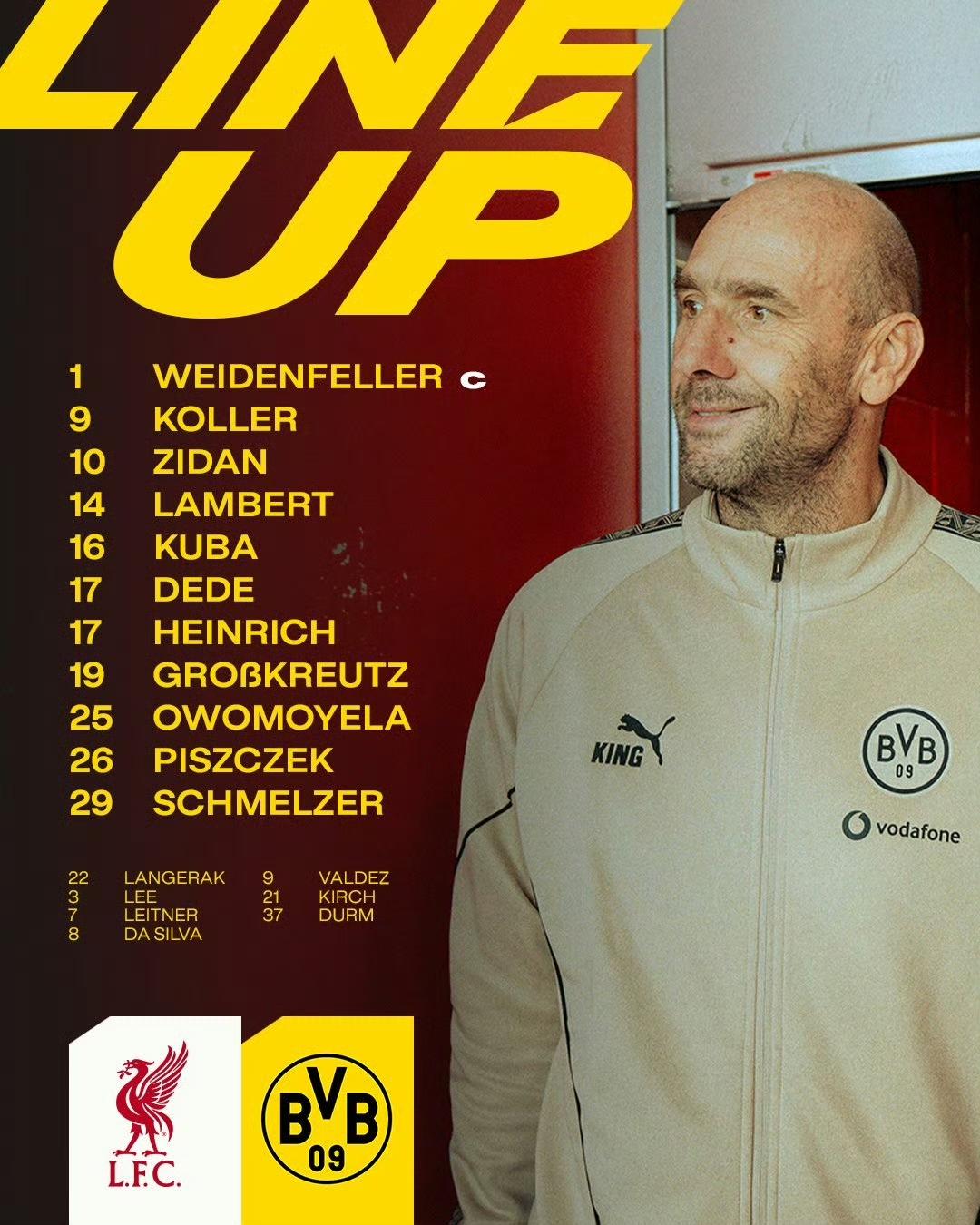 多特蒙德传奇在安菲尔德相聚,有魏登费勒,皮什切克,施梅尔策, 库巴,格罗斯克罗伊茨等这批打进打进欧冠决赛的球员,还有扬·科勒,德德,李荣杓,齐丹这批前一代的球员。