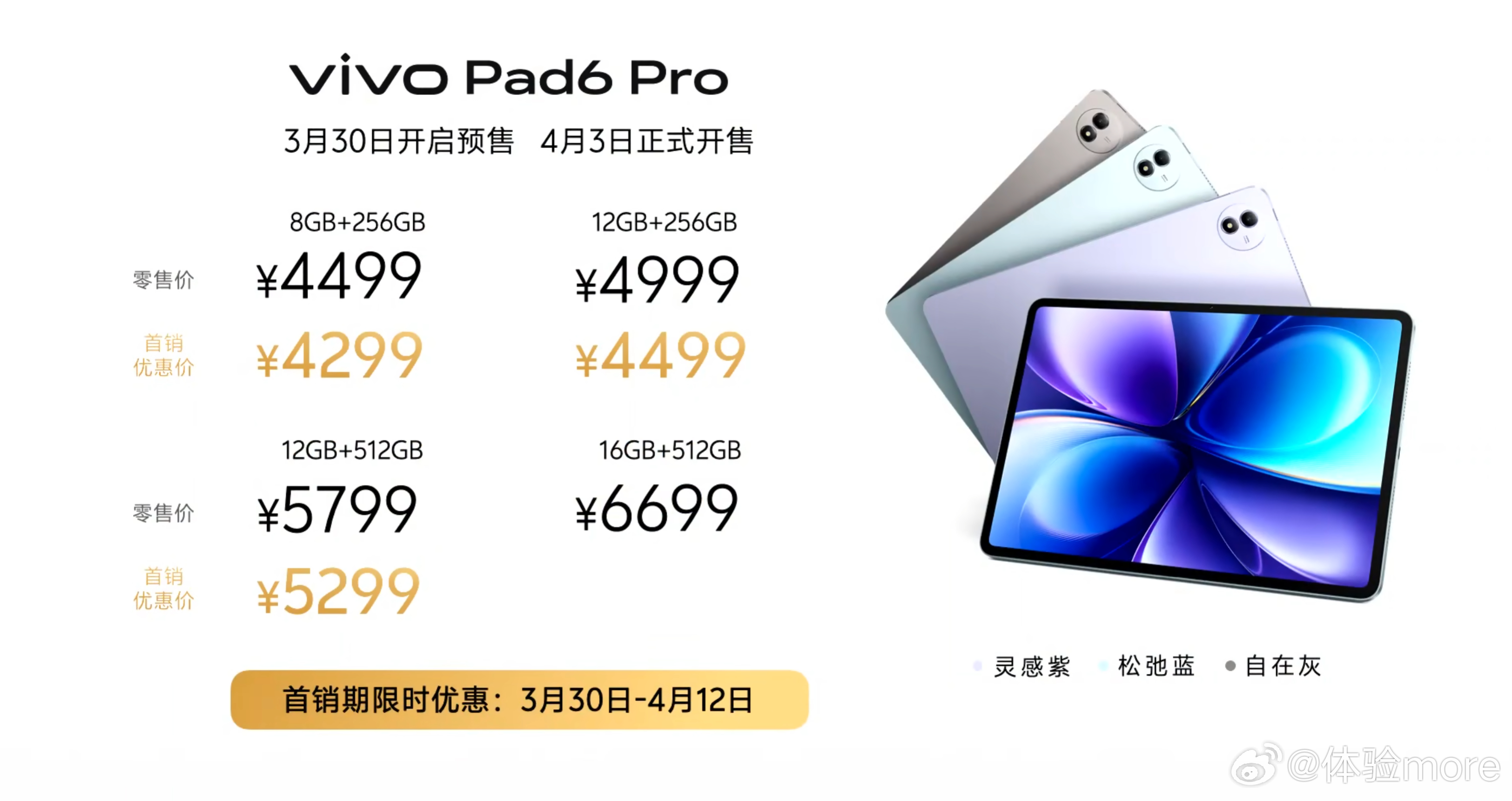 vivo Pad6 Pro价格出来了:8+256,4499,首销429912+256,4999,首销449912+512,5799,首销529916+512,6699