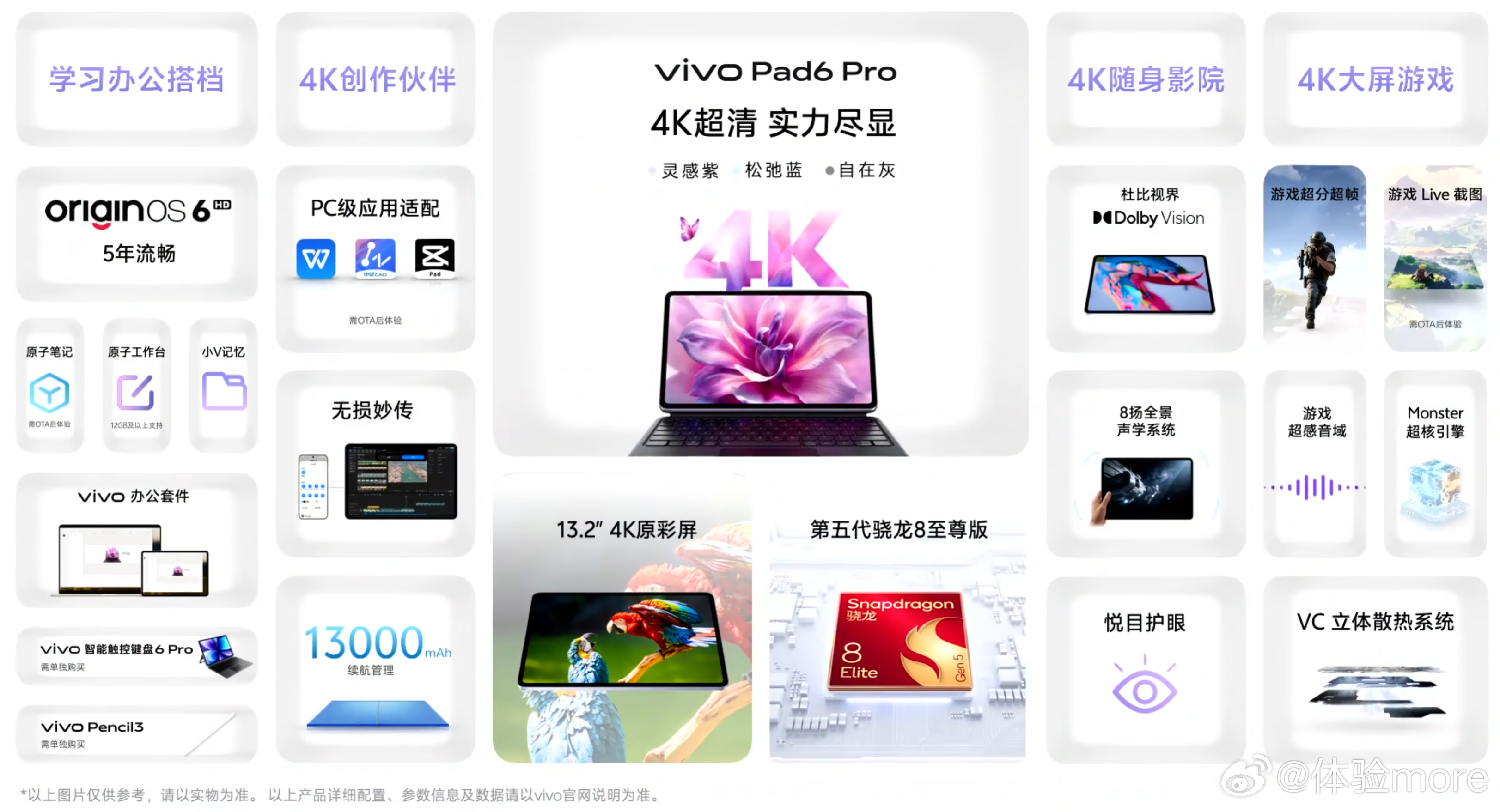 13.2英寸4K LCD屏,骁龙8E5,13000mAh,8扬声器,PC级WPS+剪映专业版。