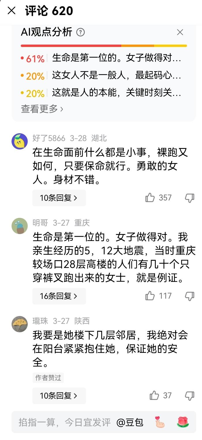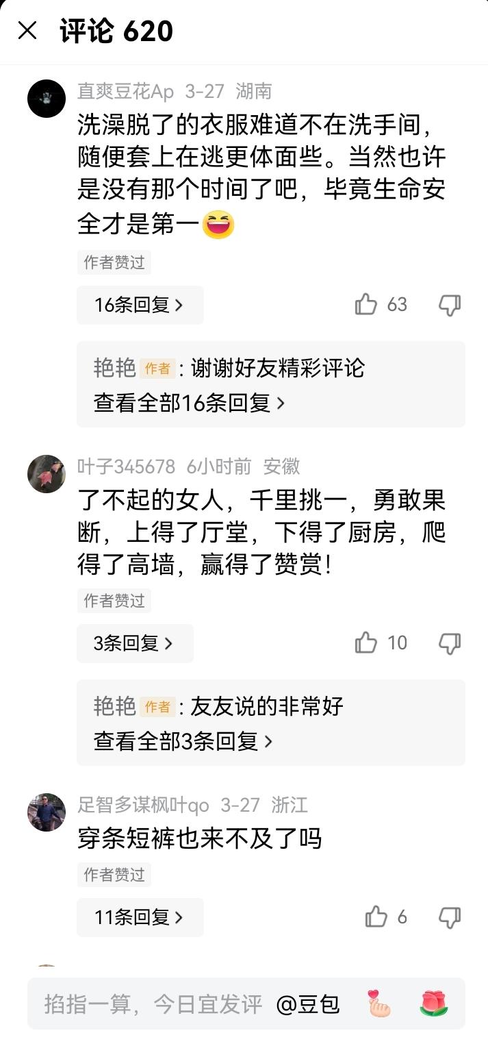 女子洗澡遇火灾赤身爬栏杆!61%网友点赞:生命面前,体面算什么? 女子在浴室里洗澡,室内突然起火。女子来不及穿衣服,翻出阳台栏杆,赤着身死死攥住防盗网,一步步往下滑——身体悬在高空晃悠,指尖抠得发白,每一步都踩在生死边缘。 这一幕引爆全网,61%网友站在“生命至上”这边: “在生命面前什么都是小事,裸跑又如何,能活下来就是赢!” “了不起的女人,勇敢果断,爬得了高墙,赢过了灾难!” “经历过地震才懂,紧急关头顾不上体面,保命才是第一!” 也有网友理性提醒:“哪怕套条短裤也好,至少能减少分心和尴尬”,但更多人共情:“火都烧到眼前了,哪还有时间找衣服?” 客观来看,攀爬外墙的逃生方式绝不可取!无防护攀爬极易坠楼,风险远高于火灾本身。但这一幕也戳中了所有人:灾难面前,体面和尊严,在生命面前轻如鸿毛。 ✅ 正确火灾自救指南,必须记死! 1. 优先走安全通道,用湿毛巾(叠3-4层)捂住口鼻,弯腰贴墙低姿撤离; 2. 楼上起火往楼下跑,楼下起火往楼顶或未起火楼层转移,寻找安全区域等待救援; 3. 坚决不爬外墙、不跳窗户,杜绝一切徒手攀楼行为! 灾难面前,冷静不是逞能,科学逃生才是对生命最基本的尊重。记住这些,关键时刻能救命! 火灾逃生指南