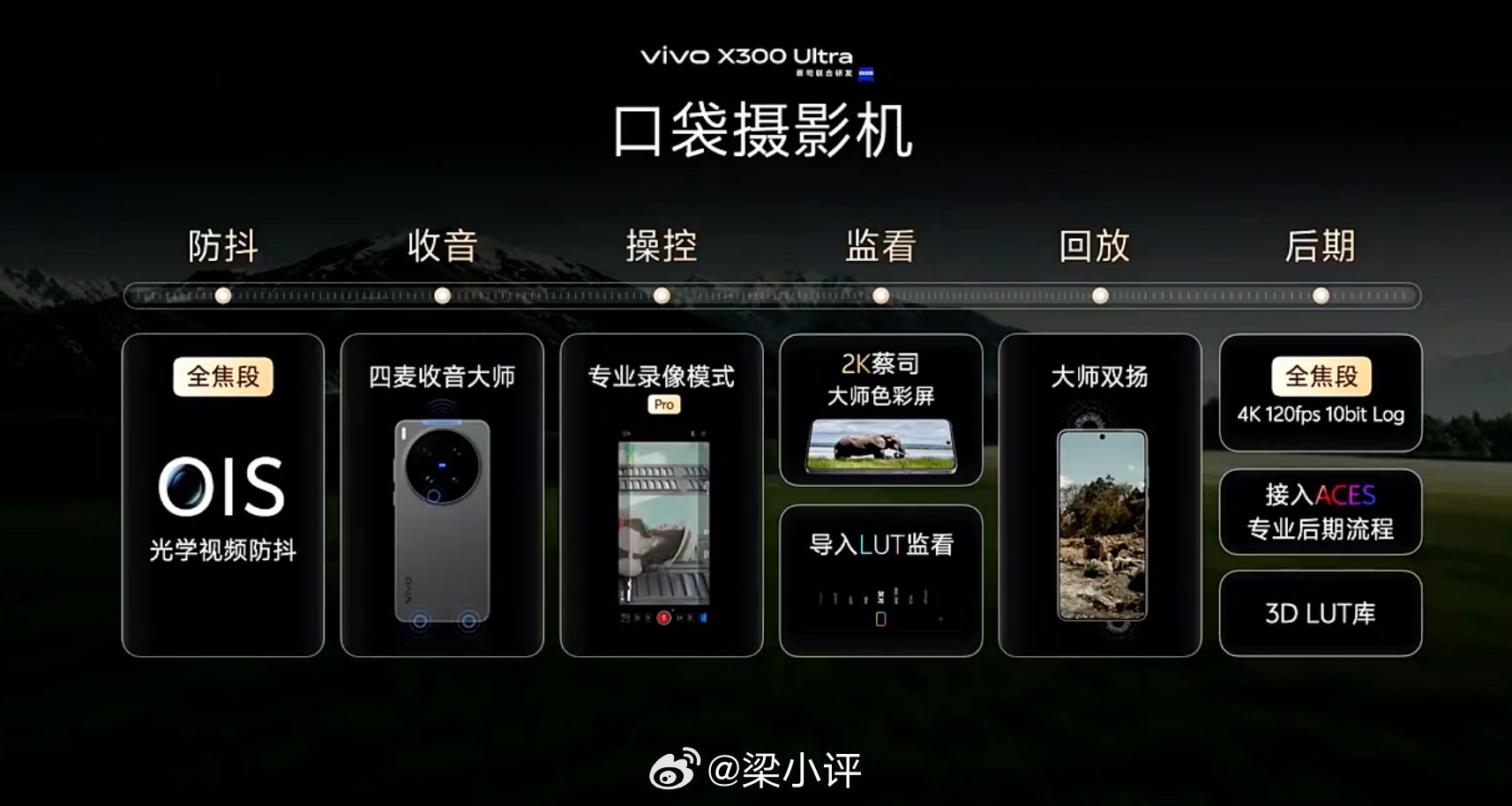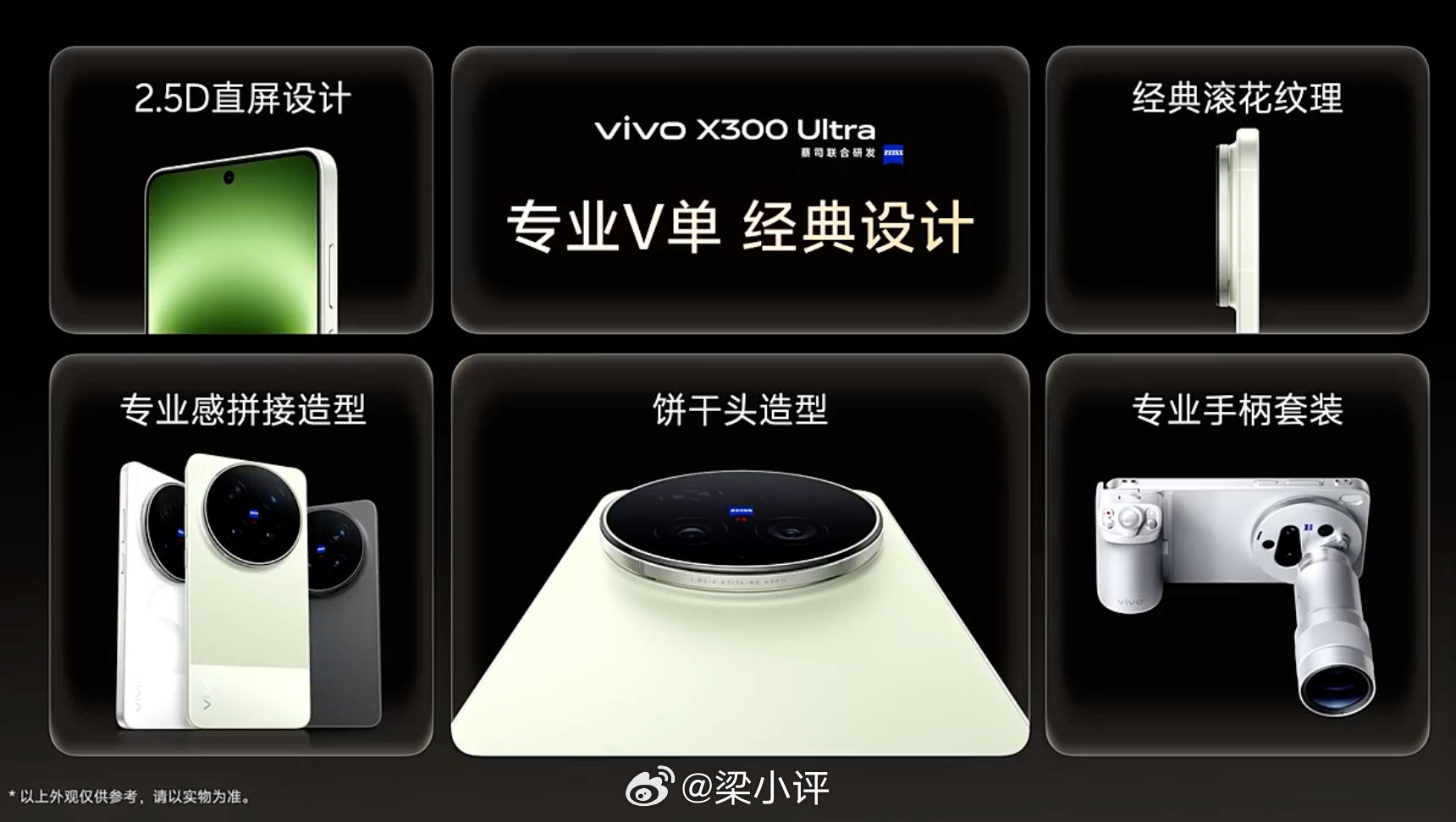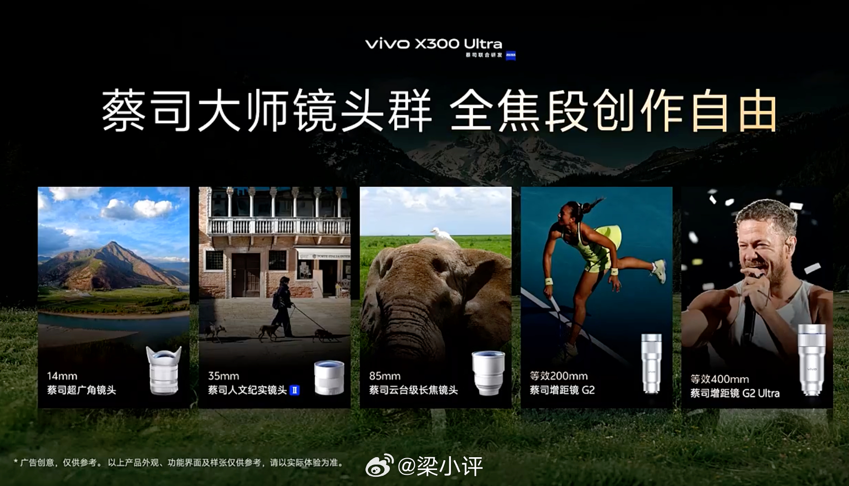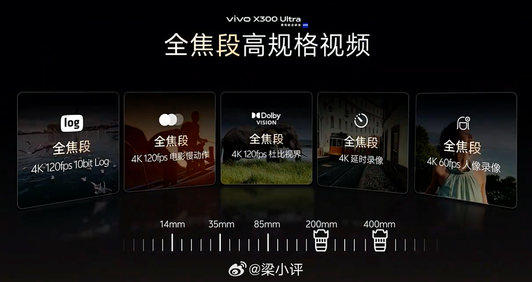 vivo X300 Ultra专业V单vivo X300 Ultra来了超广角14mm 50MP LYTIA 818 1/1.28;CIPA 6.0主摄35mm 200MP LYTIA 901 1/1.12长焦85mm 200MP HP0 1/1.4;3°OIS光学防抖和CIPA 7.0