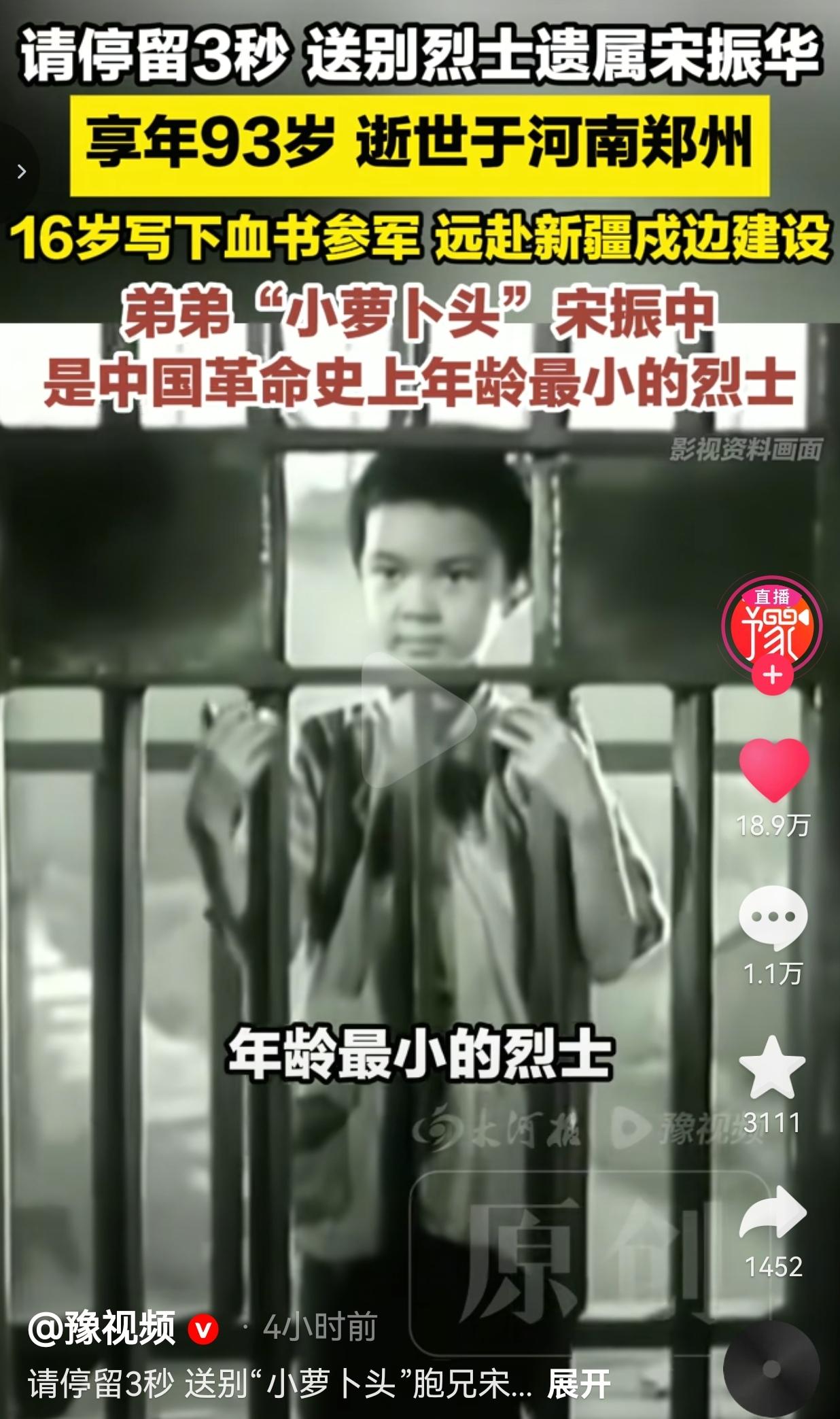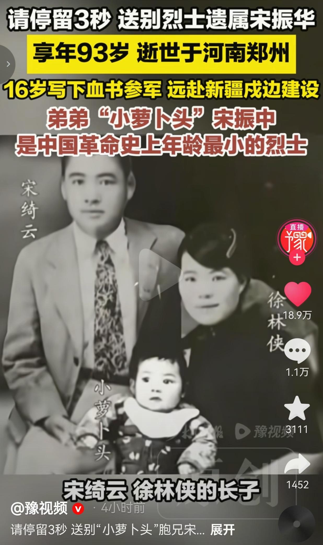 3月29日,河南郑州传来噩耗——“小萝卜头”宋振中的亲哥哥宋振华,走完了93年的人生,永远闭上了眼睛。 这条消息一出来,全网都在刷屏:请停留3秒,送送这位英雄的后人! 很多人都知道“小萝卜头”宋振中,是中国革命史上年纪最小的烈士,8个月大就跟着父母进了监狱,在阴暗潮湿的牢房里长大,连阳光都没见过几次,最后牺牲时才8岁。 可很少有人知道,他还有个哥哥叫宋振华,在16岁那年得知父母和弟弟全部遇害的消息后,咬破手指写下血书,毅然参军报国,后来远赴新疆,在戈壁荒漠里守了一辈子边疆。 宋振华是宋绮云、徐林侠的长子,本该在父母怀里撒娇的年纪,却亲眼看着家人被反动派带走。 16岁的少年,把所有的悲痛和仇恨都刻进骨子里,他在血书上写下“为父母和弟弟报仇,为新中国奋斗”,背着简单的行囊就参了军。 后来新中国成立,他主动申请去最艰苦的新疆戍边,在漫天风沙里扎根,把一辈子都献给了祖国的边疆建设,直到晚年才回到河南郑州。 他这一生,没提过自己是烈士家属,没向组织要过任何特殊照顾,只是默默守着对家人的承诺,用一生践行着“报国”两个字。 直到他离世,这段藏了一辈子的故事才被更多人知道,瞬间戳中了无数人的泪点。 网友看到后评论说:“一家满门忠烈!宋爷爷一路走好,您的家人和弟弟,永远活在我们心里!” 也有的网友说:“16岁写血书参军,一辈子戍边守国,这才是真正的民族脊梁!比那些流量明星强一万倍!” 还有的网友说: “小时候课本里学过小萝卜头,今天才知道他还有这么伟大的哥哥,泪目了,向英雄致敬!” 也有的网友说: “请记住这些名字:宋绮云、徐林侠、宋振中、宋振华,他们才是我们最该追的星!” 说实话,我看到这个消息的时候,鼻子直接酸了。我们总说岁月静好,可哪有什么天生的安稳,不过是像宋振华这样的人,替我们把苦难扛在了肩上,把热血洒在了边疆。 有人说,现在的年轻人只追明星不追英雄,可我要说,真正的英雄从来不会被遗忘! 宋振华一家满门忠烈,用生命和青春换来了我们今天的和平,这样的人,才值得我们永远铭记,永远敬仰。 他16岁写下的血书,不是一句口号,是刻在骨血里的忠诚;他一辈子戍边的坚守,不是一种选择,是对家人最好的告慰。 宋爷爷走了,但他的精神永远不会消失。他让我们明白,什么是家国情怀,什么是民族大义,什么是“为中华之崛起而奋斗”。 山河无恙,英魂不朽,一家忠烈,万古流芳!