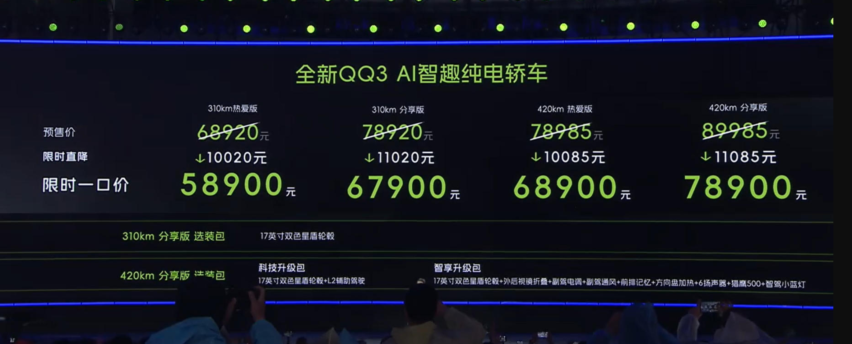 奇瑞全新QQ3限时一口价5.89万起 今晚,奇瑞全新QQ3正式上市,限时一口价区间为5.89-7.89万元。
