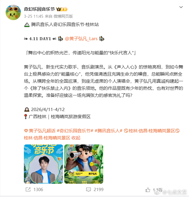 奇幻乐园音乐节官宣黄子弘凡奇幻乐园音乐节阵容升级,黄子弘凡正式官宣。他深耕音乐领