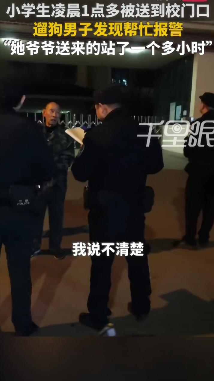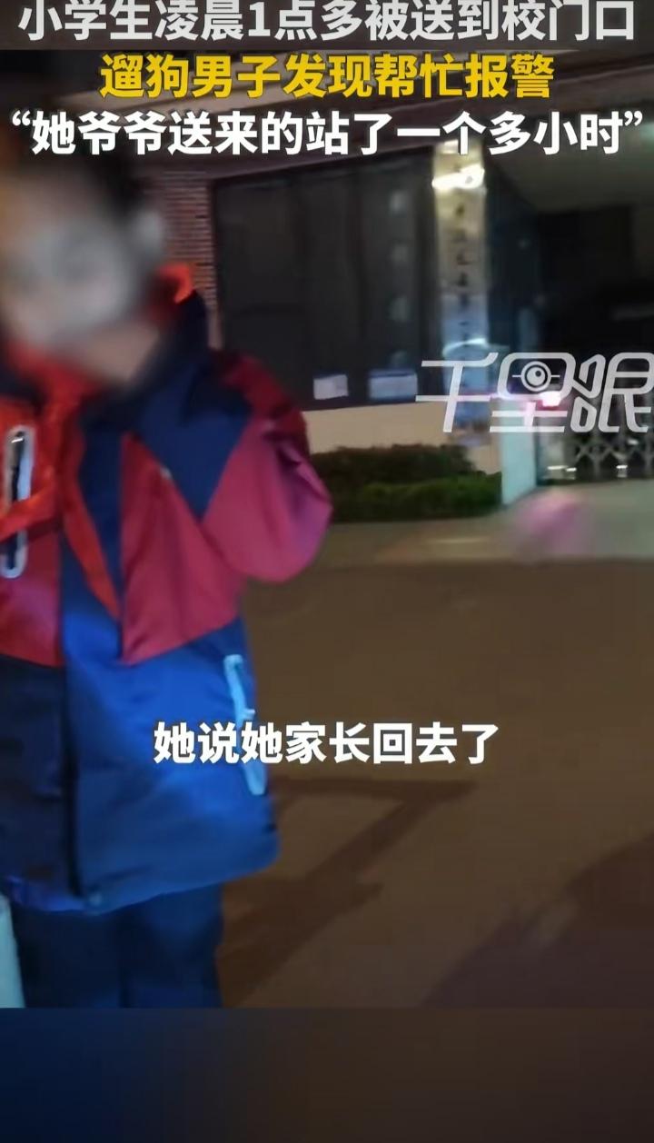 凌晨一点多,也许你已进入梦乡,也许你还在刷着短视频,也许你还在玩游戏,但你可能想不到,这个时候竟有人把孩子送到学校读书。 河南洛阳的常先生凌晨3点多出门遛狗,他所在小区对面就是一所学校,当他经过学校门前时,发现一身着红色上衣,手提文具袋,戴着红领巾的小女孩,独自站在紧闭的校门前,便上前询问。 一问才知,小女孩是该校的小学生,是80多岁的爷爷将她送到学校上学,见学校还没开门,便将女孩留在校门囗后独自回了家。 此时小女孩已经在寒风中站了近2小时,常先生觉得不可思议,怎么有这样的家长,半夜送孩子上学的?便问了小女孩爷爷的电话问个究竟。可电话打过去,爷爷在电话里说话含糊不清,无法沟通,为了小女孩的安全,常先生只好报警,警察才将小女孩送回了家。 幸亏遇上了好人常先生,不然小女孩岂不是硬生生要站到学校开门?要是遇上坏人怎么办?后果无法想象。小女孩倒是情绪稳定,不哭不闹,很淡定。 有人说,可能是爷爷患上阿尔默茨糊涂了;有人问孩子的父母呢?也有人认为可能是留守儿童,把孩子留给一个80多岁的糊涂老人,孩子多危险,做父母太不负责任。 你怎么看?