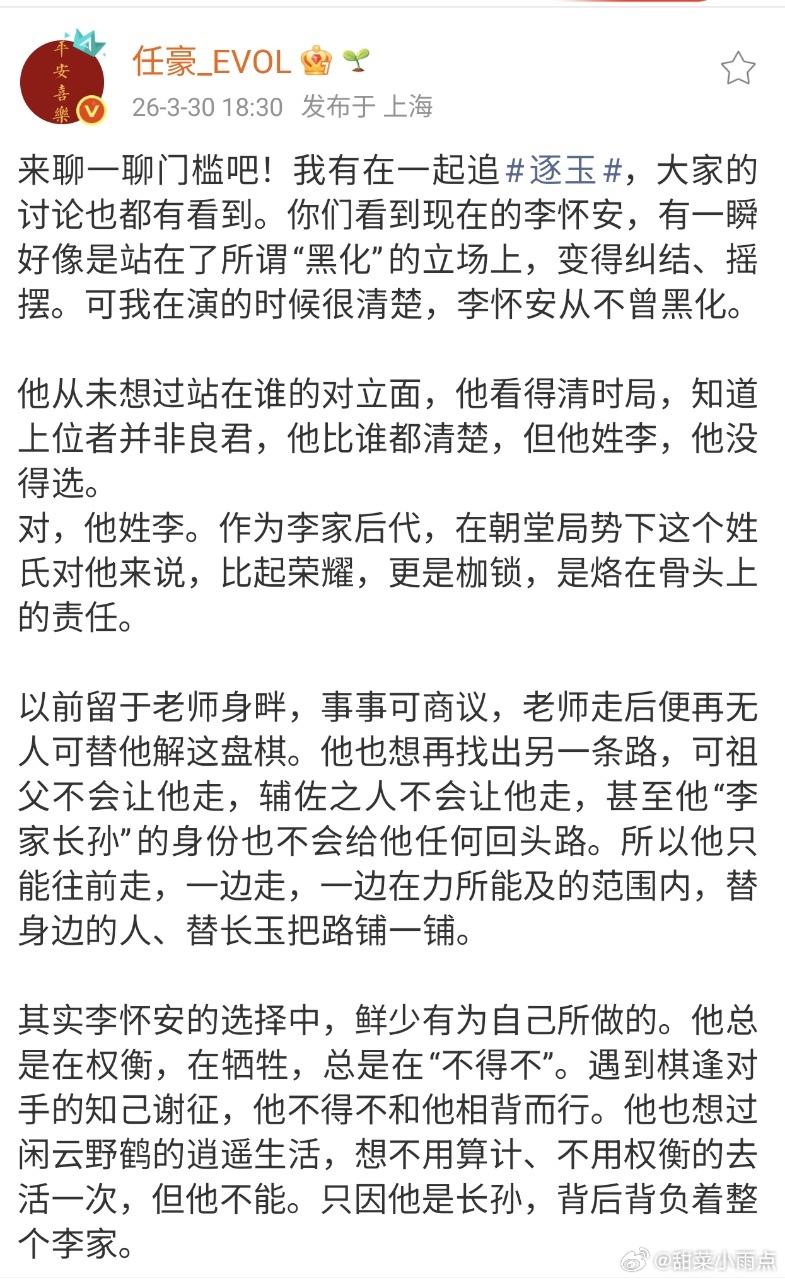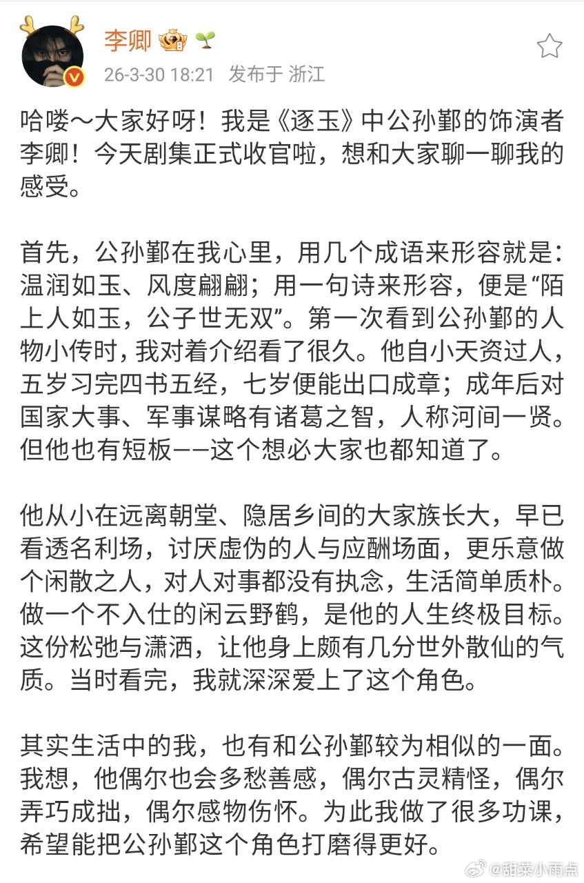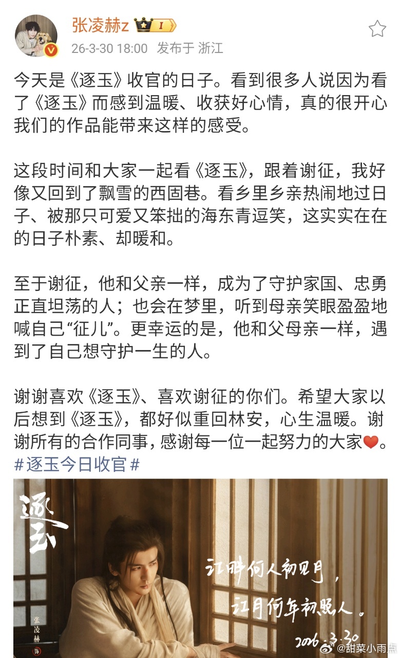逐玉收官 张凌赫逐玉收官小作文 逐玉今天收官了,主演们也纷纷发博,这个三月份