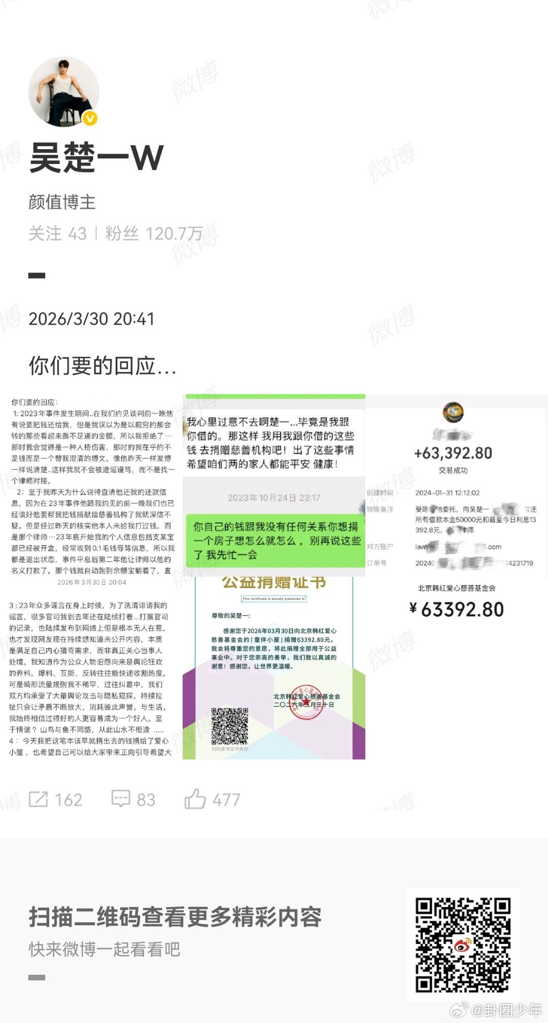 吴楚一回应与陈牧驰争议吴楚一收到陈牧驰还款后捐了吴楚一针对与陈牧驰的争议作出回应,称已收到对方还款并将款项全部捐赠。