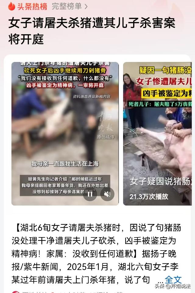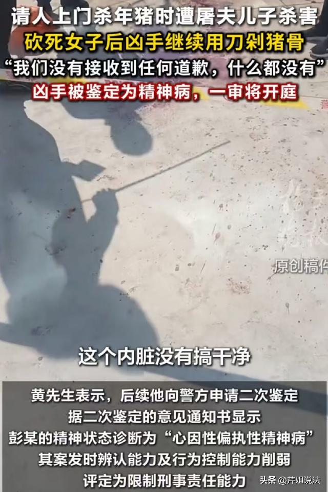 湖北南漳,62岁女子请人杀年猪,和屠夫开玩笑说了一句大肠没弄干净,谁知屠夫的儿子二话不说砍了女子脖子一刀,女子因失血过多离世。后经鉴定,屠夫的儿子有精神分裂症。女子的儿子不能接受,难道就因为他精神不正常,自己母亲要白白丢掉性命吗? 据、扬子晚报报道,这起案件发生在2025年1月11日,被害人为李某,遇害时才62岁。 李某老家是南漳的,平时一直和儿子黄先生在上海生活,母子俩只有逢年过节的时候才会回到老家。 案发当时黄先生还没放假,李某在上海没什么事,就提前回老家准备过年需要的东西,准备趁春节和亲朋好友们好好聚一聚。 李某老家有杀年猪的习惯,每到年前,家家户户都会找杀猪匠去自己家杀年猪,每年的这个时候也是杀猪匠们最忙的时候,谁家想要杀猪,都得提前打招呼排队。 1月11日,终于轮到李某家了,一大早杀猪匠老彭就背着工具赶去了李某家。 因为那段时间太忙,老彭一个人忙不过来,就叫上儿子彭某给他帮忙。 当天上午10:00左右,李某家的猪基本处理好了,彭某正在将最后几大块肉砍成小块,老彭收拾完猪下水,开始和李某交接。 李某检查了一番后对老彭说,肠子处理的不太干净。 大家都是熟人,李某不可能真的追究什么,这句话也是当玩笑说的,可让人没想到的是,这句话让在旁边砍肉的彭某听见了,彭某当真了。 李某说了老彭一句,老彭只是笑了笑,就去忙别的了,当天过来按年猪的亲朋好友们也都在一边聊天说笑,谁也没有注意到李某这边的情况。 李某话音刚落,彭某突然拎着斩骨刀走到李某身后,对准她的头枕部就是一刀,随后扭过身,若无其事继续砍肉。 这一幕发生的太突然,李某捂着脖子倒在地上,旁边的亲朋好友好一阵才回过神来。 随后有人打了120并报了警,可惜的是,在送医的过程中,李某因失血过多离世了。 彭某为什么会突然行凶呢?原来,彭某原本很正常,还曾结过婚,后来离婚了,就出现了精神方面的问题。 案发后,民警对彭某进行了两次精神鉴定,两次均显示,案发时彭某自控能力较弱,属于限定刑事责任能力人。 案发后,杀猪匠老彭赔给了李某家属5万块钱丧葬费,但从那以后再也没露面过,也没有向他们家道过歉。 李某的儿子黄先生不能接受,李某平时身体健康,怎么也能再活三二十年。彭某因为一句话就动手,不能因为他有精神问题,就让自己母亲白亖了吧? 那么彭某的行为应该如何认定?精神疾病能否免除对他的刑事处罚? 彭某因为李某的一句玩笑话,拎着斩骨刀走到李某身后实施伤害行为,反映出彭某具有非法剥夺他人生命的故意。并且,这一行为直接导致李某离世。 根据《刑法》第二百三十二条规定,故意杀 人的,处死刑、无期徒刑或者十年以上有期徒刑;情节较轻的,处三年以上十年以下有期徒刑。 彭某涉嫌故意杀 人罪,应当受到刑事处罚,但是,彭某得了精神方面得疾病,案发时属于限制刑事能力人。 对于这种情况,《刑法》第十八条有明确规定,精神病人在不能辨认或者不能控制自己行为的时候造成危害结果,经法定程序鉴定确认的,不负刑事责任;间歇性的精神病人在精神正常的时候犯罪,应当负刑事责任;尚未完全丧失辨认或者控制自己行为能力的精神病人犯罪的,应当负刑事责任,但是可以从轻或者减轻处罚。 案发后,彭某的两次精神鉴定结果,均显示案发时彭某自控能力较弱,属于限定刑事责任能力人。 这就意味着,案发时彭某虽然精神不正常,但并未完全丧失辨认和控制自己行为的能力。 所以,彭某要承担刑事责任,不过可依据法律从轻或者减轻处罚。 除了赔偿,彭某还应承担相应的民事赔偿。 根据《民法典》中的相关规定,彭某及其监护人应承担侵权责任。 老彭作为彭某的监护人,仅支付5万丧葬费远远不够,还需要对李某家属进行合理赔偿,包括亖亡赔偿金、丧葬费、被扶养人生活费等。 目前,本案正在公诉阶段,4月1日即将进行公开审理。