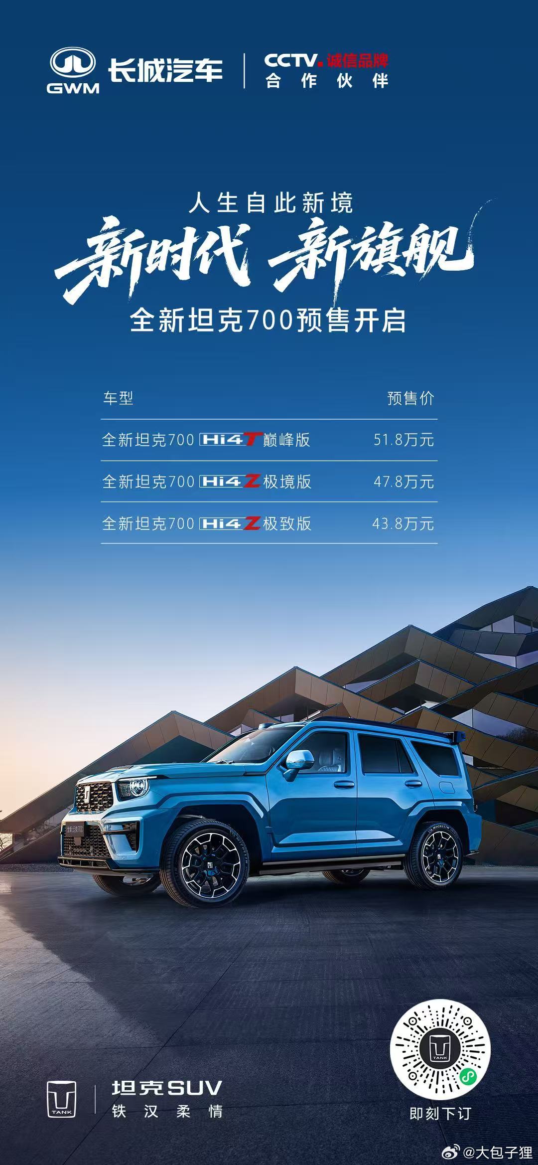 老魏一直努力把越野文化普及,而坦克700也是走向大众最浪漫和赛博的尝试。全新坦克700新时代新旗舰跟着魏建军看懂全新坦克700全新坦克700预售43.8万元起