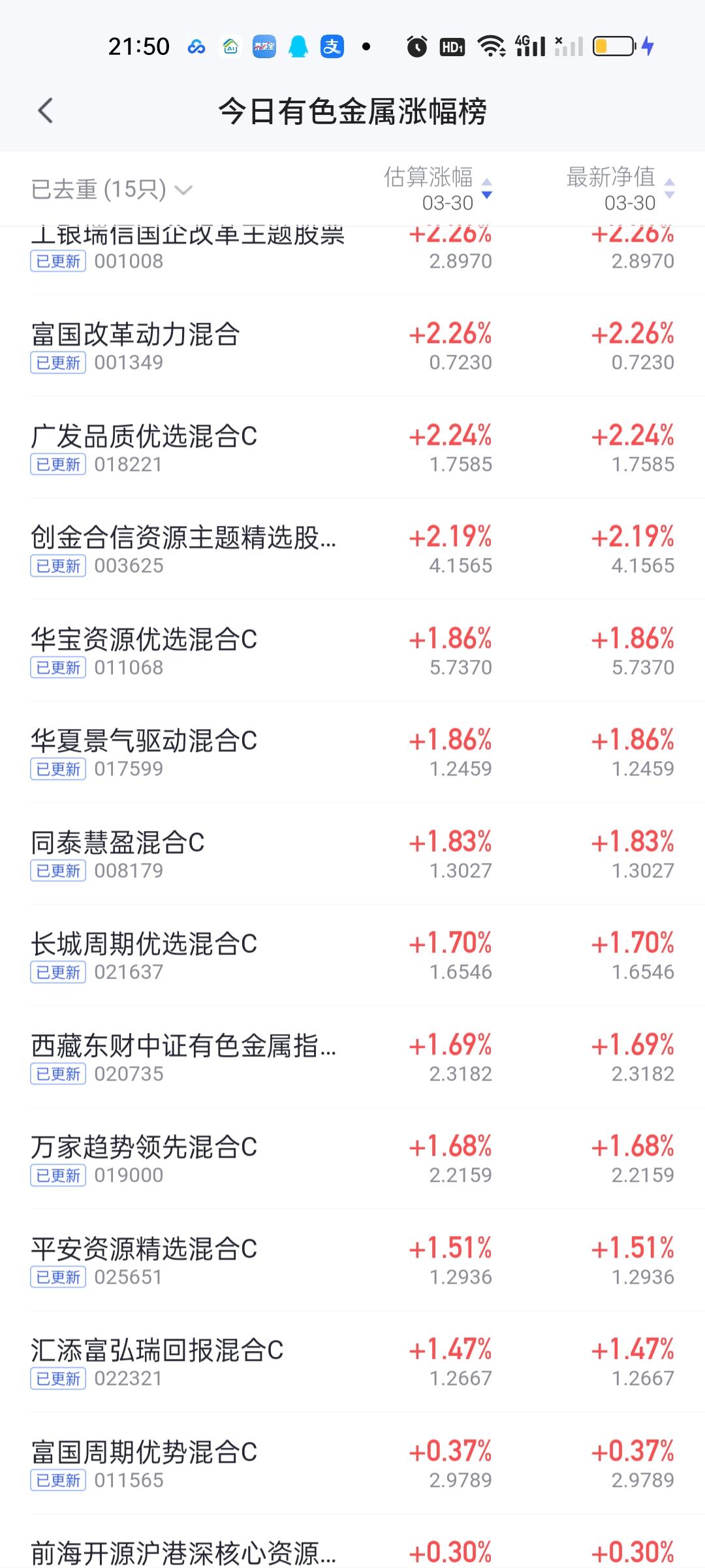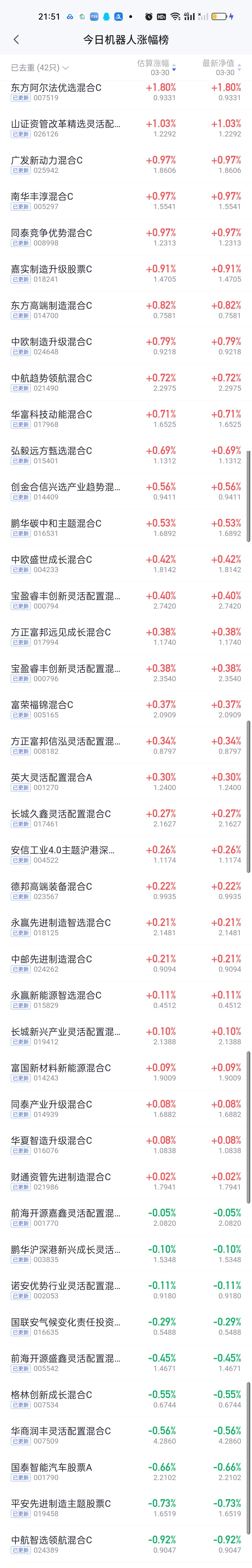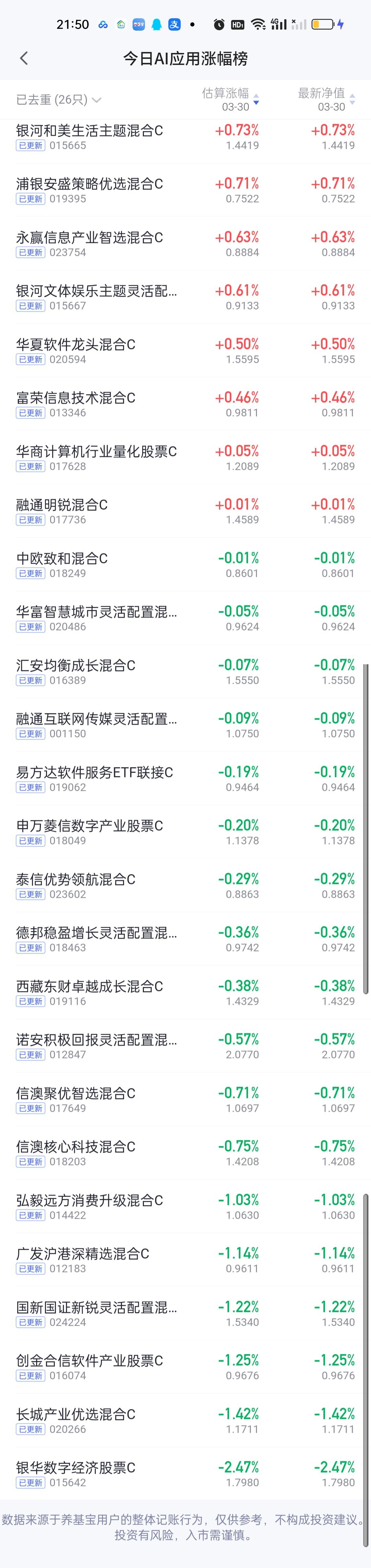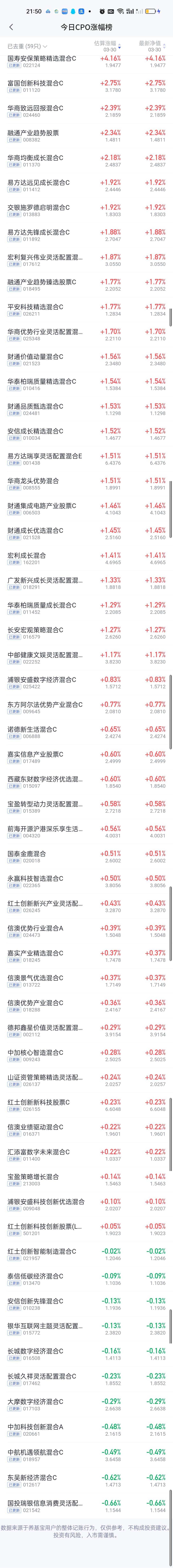 今日基金净值榜已全部更新完毕!涨幅榜方面,西藏东财景气驱动5.07%排名第一,万家周期视野股票4.40%排名第二,永赢资源慧选4.26%排名第三,国寿安保策略精选4.16%排名第四,国寿安保数字经济4%排名第五。浦银安盛周期优选3.98%排名第六,金信景气优选3.94%排名第五。中邮核心主题,中邮核心成长,广发招利,广发远见也榜上有名。 跌幅榜方面,信澳产业优选一年持有期5.13%排名第一,银河核心优势3.96%排名第二,平安中证光伏3.42%排名第三,广发电力公用事业3.38%,国融融君3.37%分列第四第五。一年定期这么大跌幅确实太伤基民的心了,因为是定期,卖也卖不了,只能被动接受。 有色金属,商业航天,AI应用,CPO,机器人,创新药涨幅榜一并奉上!