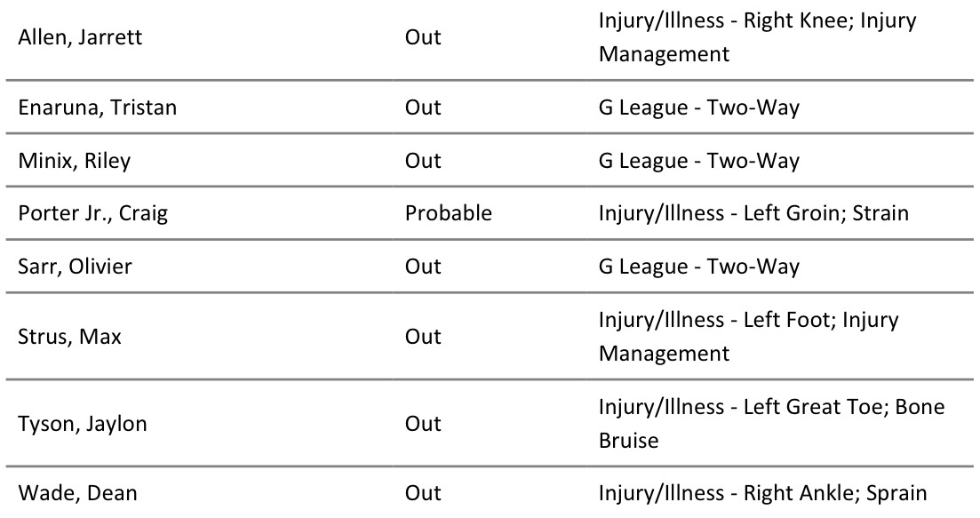 骑士明天和后天也将迎来客场背靠背比赛,先打爵士再打湖人。今天早些时候发布的伤病报告显示,骑士将在明天与爵士的比赛中轮休中锋阿伦和侧翼大将斯特鲁斯。此外,杰隆·泰森和迪恩·韦德都将因伤缺席此次三连客之旅。