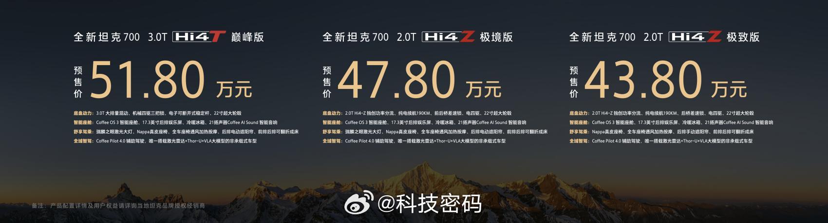 全新坦克700正式开启预售,官方预售价43.80万-51.80万元,推出3.0T Hi4-T与2.0T Hi4-Z两大动力版本共3款车型。全新坦克700新时代新旗舰全新坦克700全域豪华suv新旗舰新车以中国传统文化“麒麟”为设计灵感,外观复刻瑞兽昂首蹲坐的磅礴气场,内饰遵循“天地有序”的东方理念,打造中正大气的对称式座舱。专属“敦煌青”配色以纳米级工艺还原千年国色。智能科技方面,新车行业首搭VLA大模型,配合激光雷达与高算力芯片,实现从起点车位到终点车位的全场景NOA,智驾决策全程可视化。全新一代Coffee OS 3智能座舱支持7屏联动,配合杜比全景声音响、智能冷暖箱及全员满配舒适座椅,带来全场景豪华体验。动力上,3.0T Hi4-T专注极限越野,系统综合功率395kW、扭矩800N·m;2.0T Hi4-Z主打城市泛越野,综合功率635kW、纯电续航190km。五层递进式滤振体系配合螺簧与空簧双悬架方案,实现百万级舒适体验,以原创设计与全栈自研技术重塑全球豪华越野价值标杆。