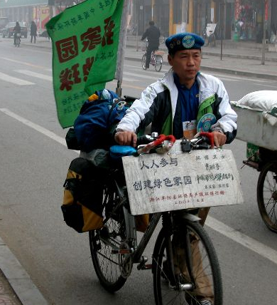 据此前报道,曹胜亭被称为“中国单骑环保行卫士”。1993年10月,他为实现环保理想,辞去工作,从海南“天涯海角”出发,计划用15年的时间骑单车走遍中国。到了2013年,他已走过20多个省份,骑行6万多公里。每到一个地方,曹胜亭都通过书法、漫画、发放环保筷、演讲等方式向人们宣传环保。一则媒体发布的怀旧影像中,一位身穿红色皮衣的青年骑着插着旗帜的单车穿行于人群中,面向镜头露出微笑,画外音介绍他是“青年书法家曹胜亭”,有网民在评论区说:“这个老爷爷现在在武汉街道口流浪。”