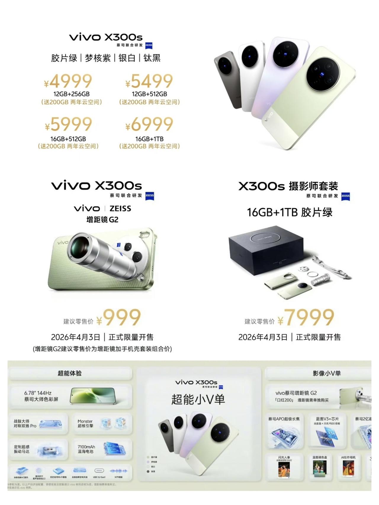 vivo X300s和vivo X300 Ultra发布,4999元起! vivo X300s算是涨价了,而且涨价力度还不小。12GB+256GB起售价调整至4999元,16GB+1TB版本售价6999元。如果加上摄影师套装就是7999元,这价格属实是不便宜,知道内存增加但这也太狠了。 产品主要优势还是集中在影像方面,不可否认,vivo X300s的影像还不错,同时也有了7100毫安的电池,有些进步,但还是贵。 vivo X300 Ultra售价6999元至8999元,加摄影师套装是11999元,这个符合预期。参数啥的无可挑剔,基本都是顶级水平,尤其是相机部分,算是行业天花板级别的。但这一代设计没啥意思,而且除了极致的影像系统其它亮点并不多。 如果不是在乎极致影像,现在也没必要买;如果是vivo X300系列用户,那就更不用买了,这个价格没必要。如果想体验优秀的影像系统,预算充足那可以买。