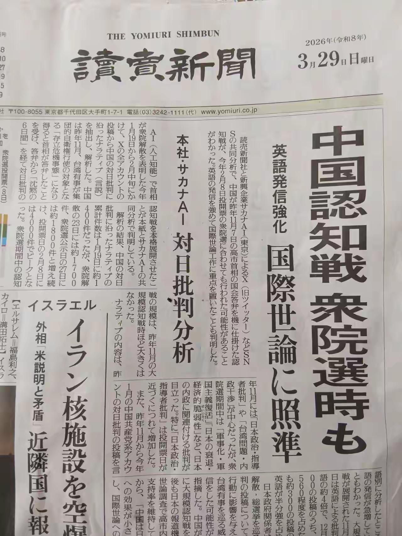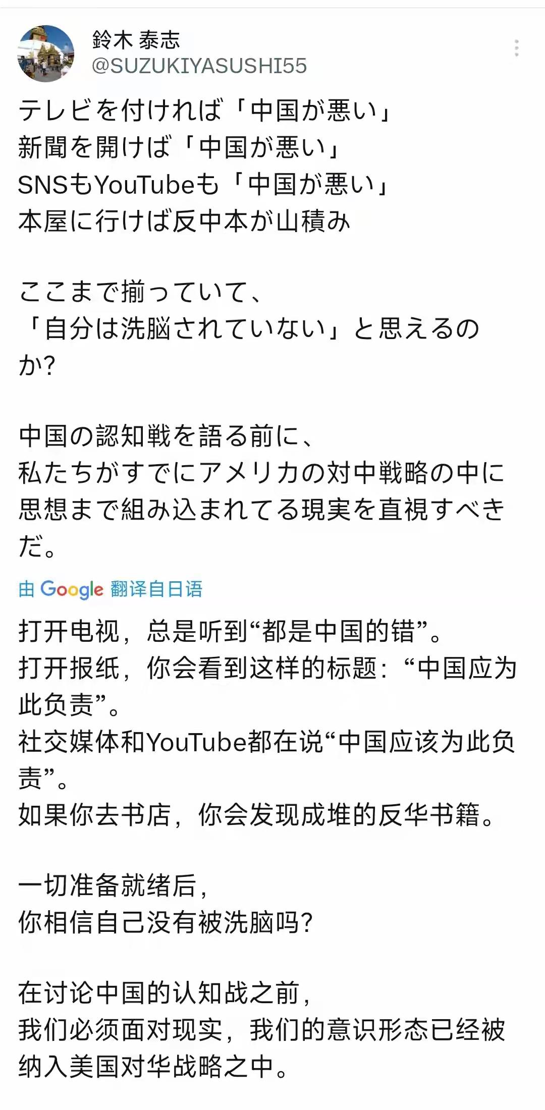 日本罕见清醒声音!3月29日,日本人士铃木泰志公开发文,猛烈抨击《读卖新闻》等右翼媒体炒作“中国认知战”的荒谬论调,一番话戳破了日本舆论场长期被操控的真相,在满是反华噪音的日本社会,显得格外清醒难得。 铃木泰志直言:打开电视,充斥着“都是中国的错”;翻开报纸,满眼是“中国必须负责”;社交媒体与视频平台,统一话术甩锅中国;就连书店,也摆满了成堆的反华书籍。当舆论被全方位包围,又有谁能保证自己没有被洗脑?在指责中国发动认知战之前,日本更该正视现实——整个国家的意识形态,早已被牢牢绑在美国的对华战略战车之上。 这样敢于说真话的日本人,如今实在凤毛麟角。长期以来,《读卖新闻》等右翼喉舌不断颠倒黑白,将中国正常的国际发声、合理的国家利益维护,恶意污名化为“认知战”,以此炮制中国威胁论,煽动民间对立情绪。 真正的认知操纵,恰恰是日本右翼媒体日复一日灌输的结果。从电视、报纸到网络、书店,反华叙事无孔不入,形成闭环式舆论洗脑,让不少民众在潜移默化中接受偏见、盲从仇恨。可他们非但不反思自身的舆论操控,反而倒打一耙,把脏水泼向中国,其双标与虚伪令人不齿。 日本舆论如此高度统一地反华,绝非自然形成,而是政客与媒体精心策划的产物。右翼势力借炒作“中国认知战”,为自身扩军修宪寻找借口,为讨好美国充当马前卒寻找理由,把日本绑上遏华战车,以此换取自身政治利益。 他们用谎言制造对立,用偏见煽动仇恨,让整个日本社会沉浸在虚假的敌意之中,丧失独立判断。一边心甘情愿被美国洗脑,一边义正词严指责中国,这场自欺欺人的闹剧,本质上是日本右翼为谋求军事松绑、依附美国霸权而编造的政治谎言。 铃木泰志的发声,像一道微光,刺破了日本舆论场的黑暗。他敢于直面真相,敢于戳破美国的操控与本国媒体的虚伪,敢于提醒民众警惕被洗脑而不自知,这份勇气与清醒,尤为可贵。 当今世界,真正的认知战,从来不是中国的正常发声,而是美日同盟操纵舆论、妖魔化他国、制造地区对抗的险恶操弄。日本若继续执迷不悟,甘愿做美国的舆论棋子,最终只会沦为大国博弈的牺牲品,付出沉重代价。而像铃木泰志这样保持独立思考、拒绝被洗脑的人,才是日本真正该珍惜的理性力量。